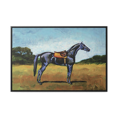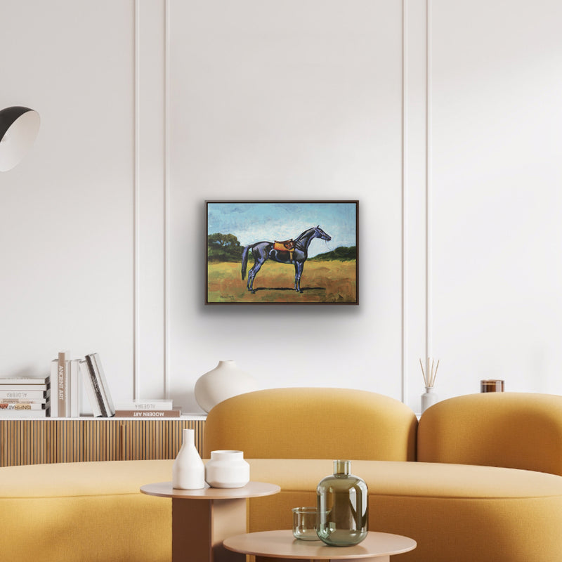 Acrylic painting of a black 18th century thoroughbred race horse.