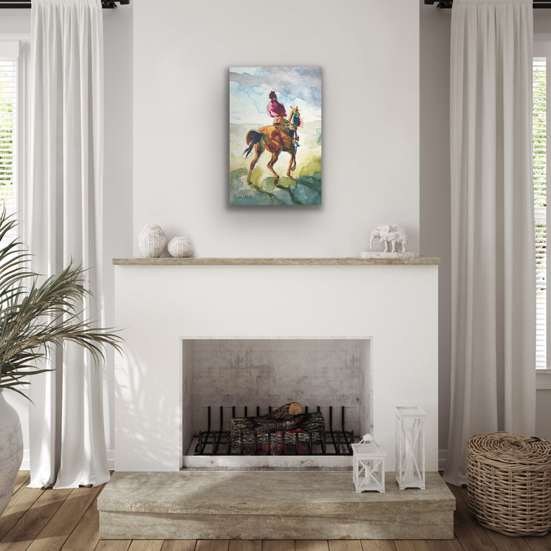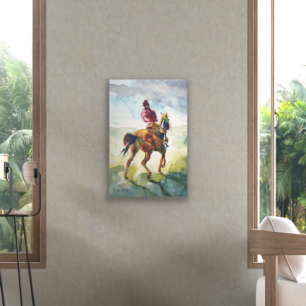 Watercolor painting of a rider and his horse in a landscape of grass and sky.