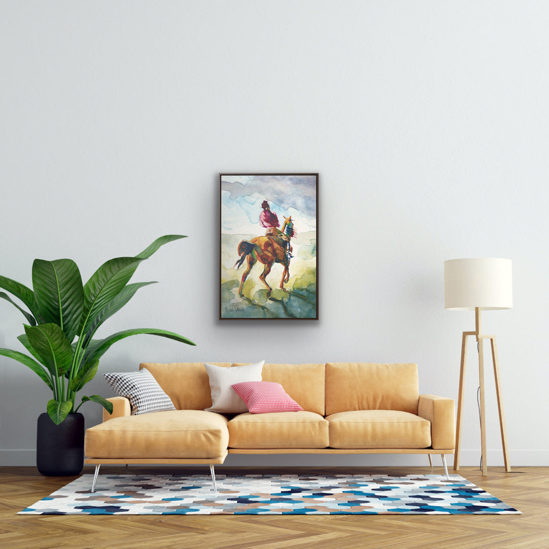 Watercolor painting of a rider and his horse in a landscape of grass and sky.