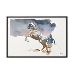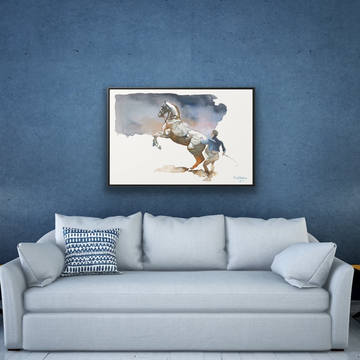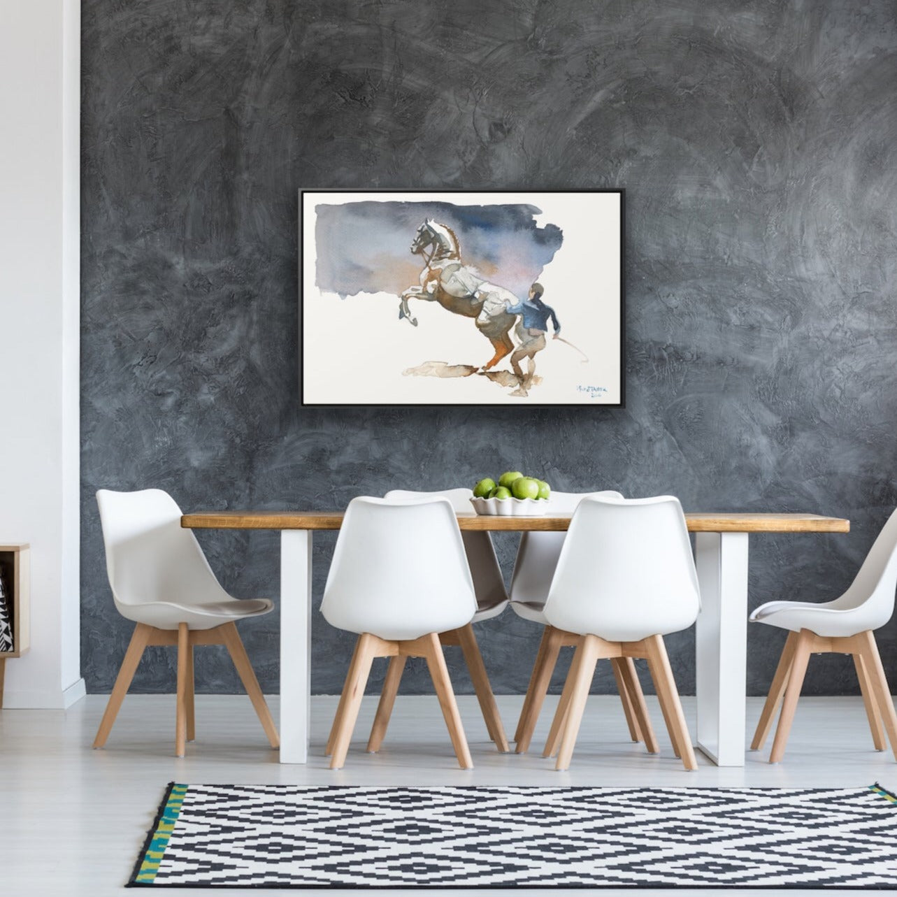 Watercolor painting of a trainer preparing an Andalusian horse for the art of dressage.