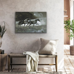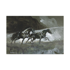 Acrylic painting of two Andalusian horses striding in the wilderness.