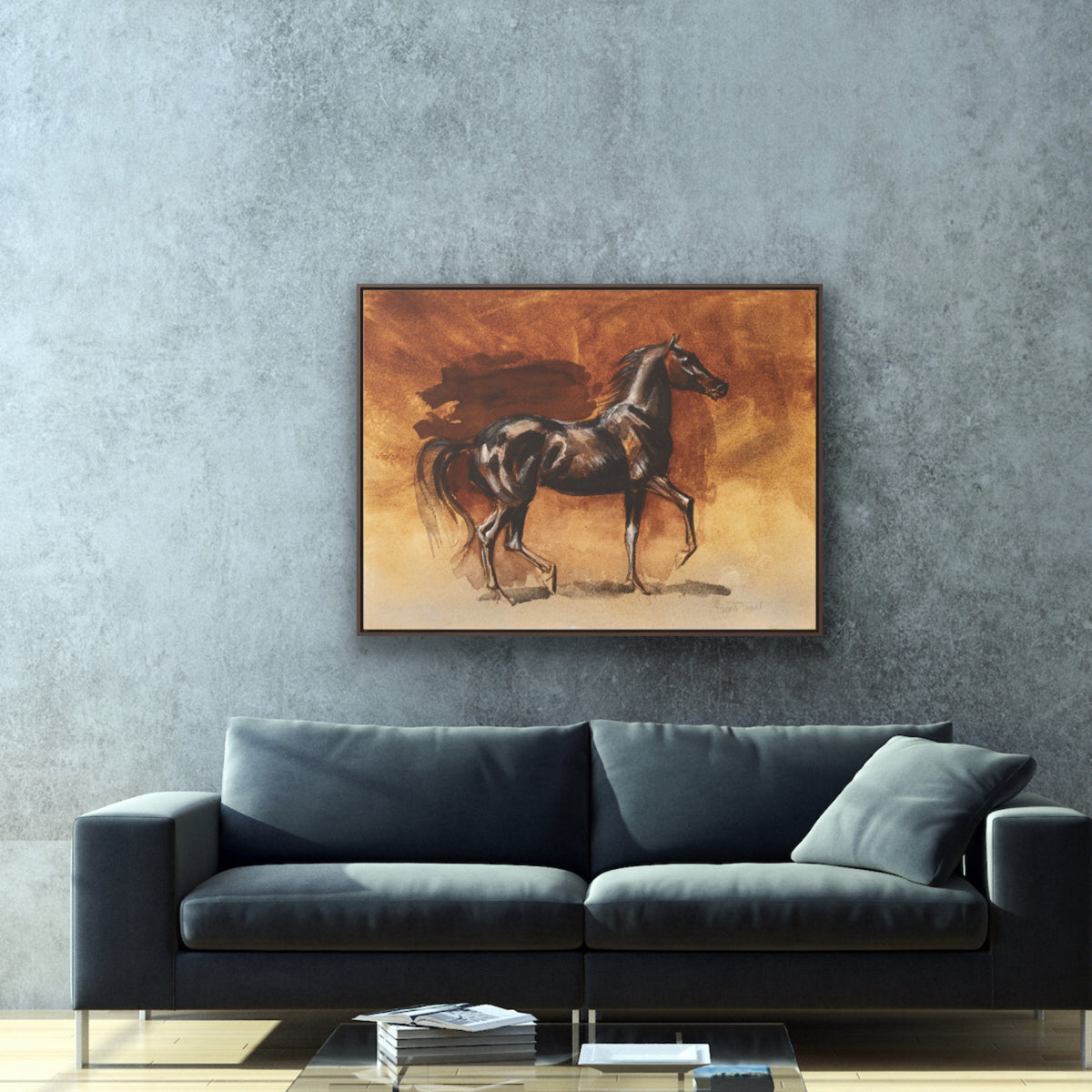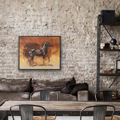 Watercolor painting of a Black Arabian horse on a brown background.