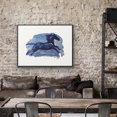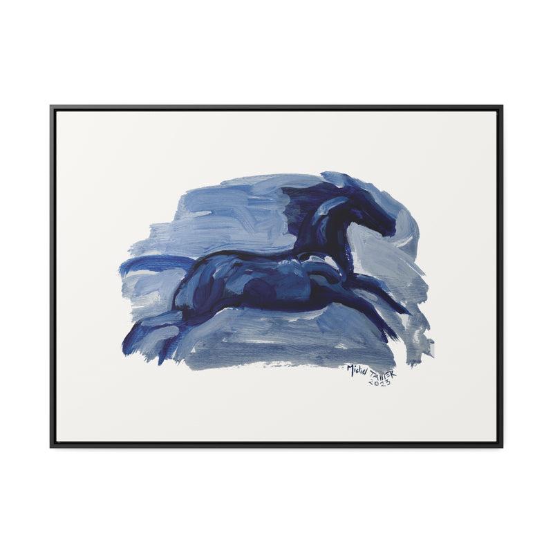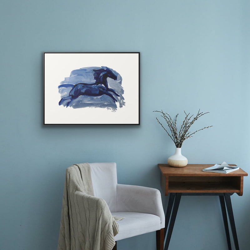 Acrylic Painting of a Blue Arabian horse galloping freely in the openess of the sky at dawn.