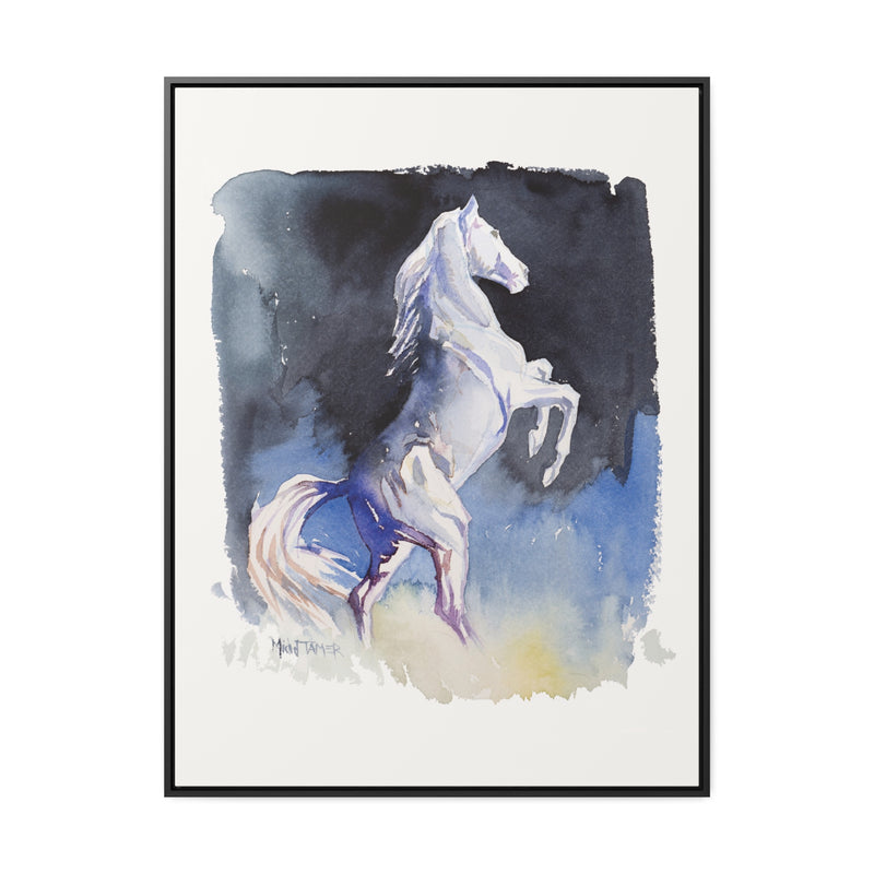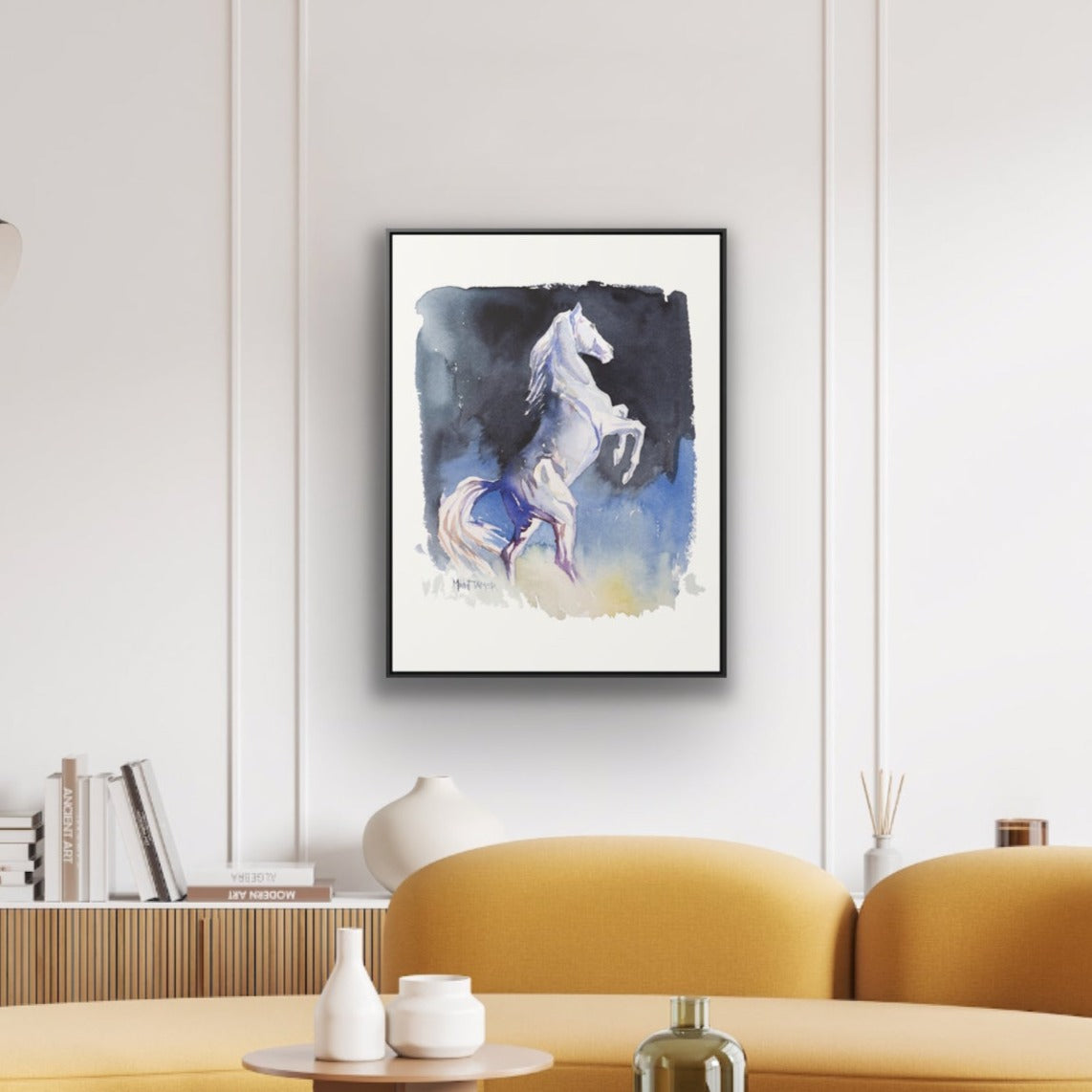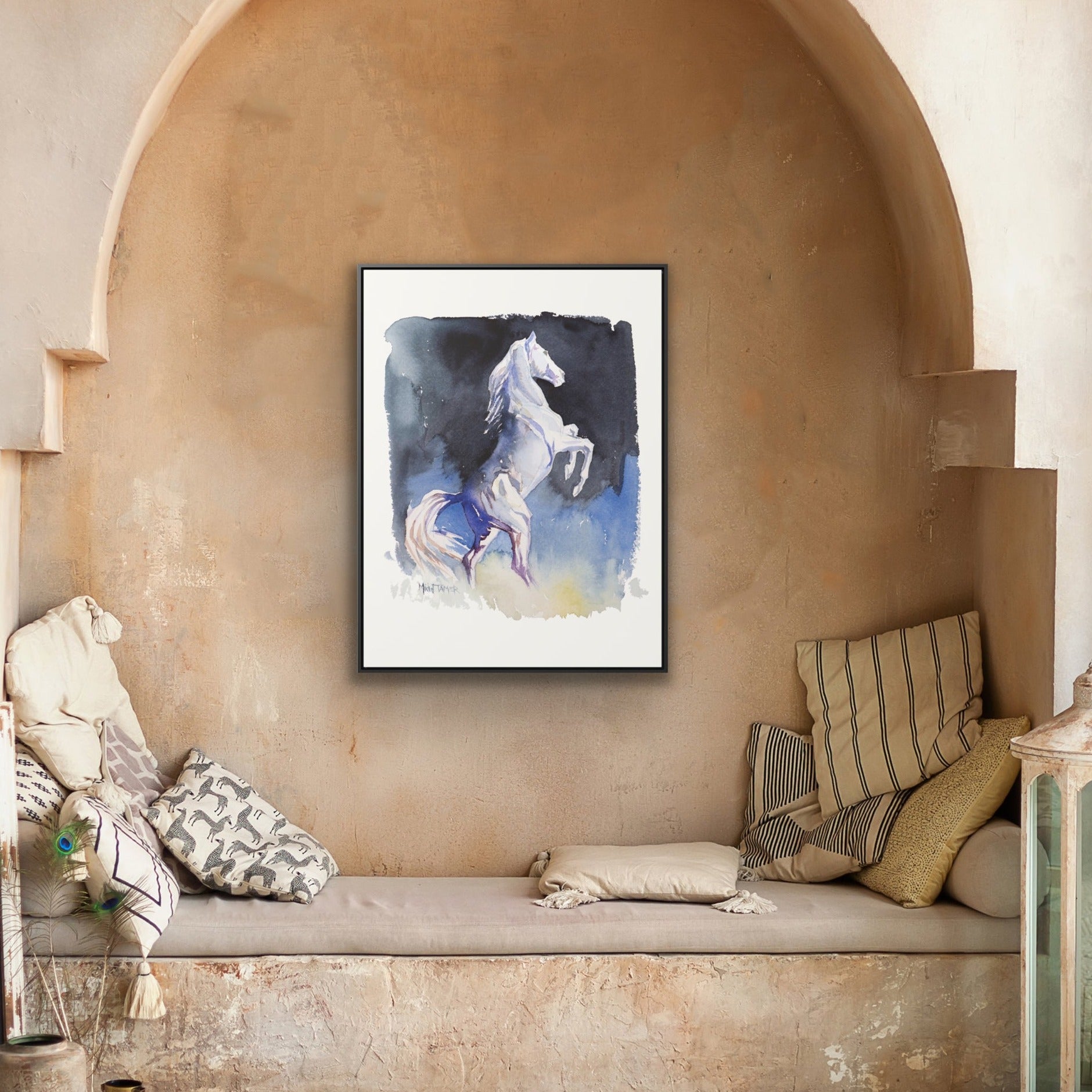Watercolor painting of a white Arabian horse rearing at dusk.