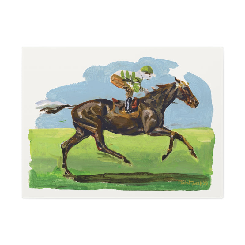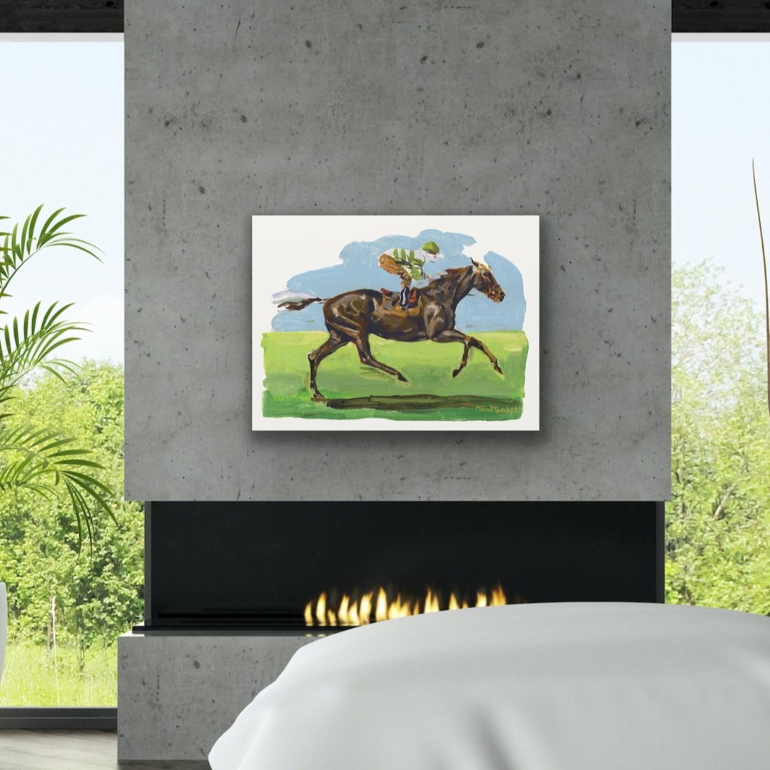 Acrylic painting of a brown thoroughbred horse and its jockey racing on a nature background.
