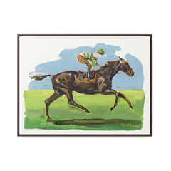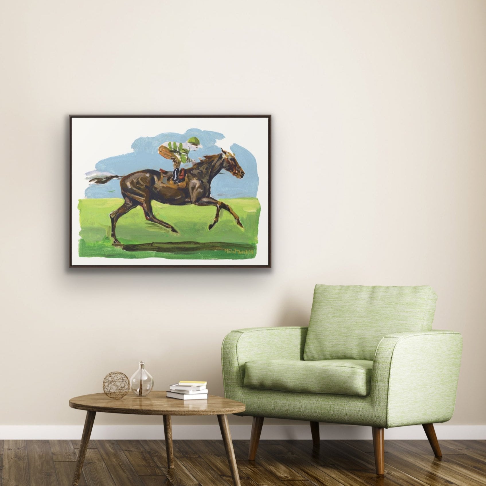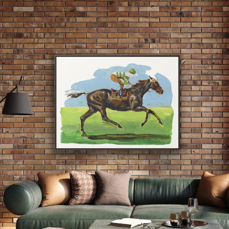 Acrylic painting of a brown thoroughbred horse and its jockey racing on a nature background.