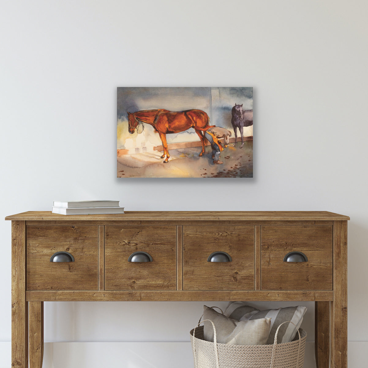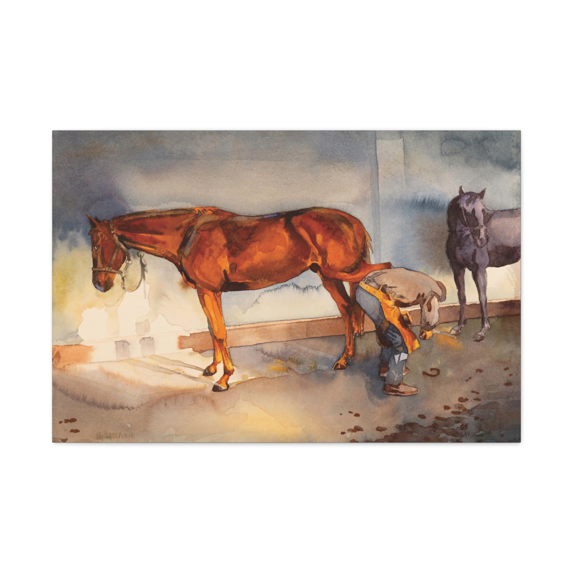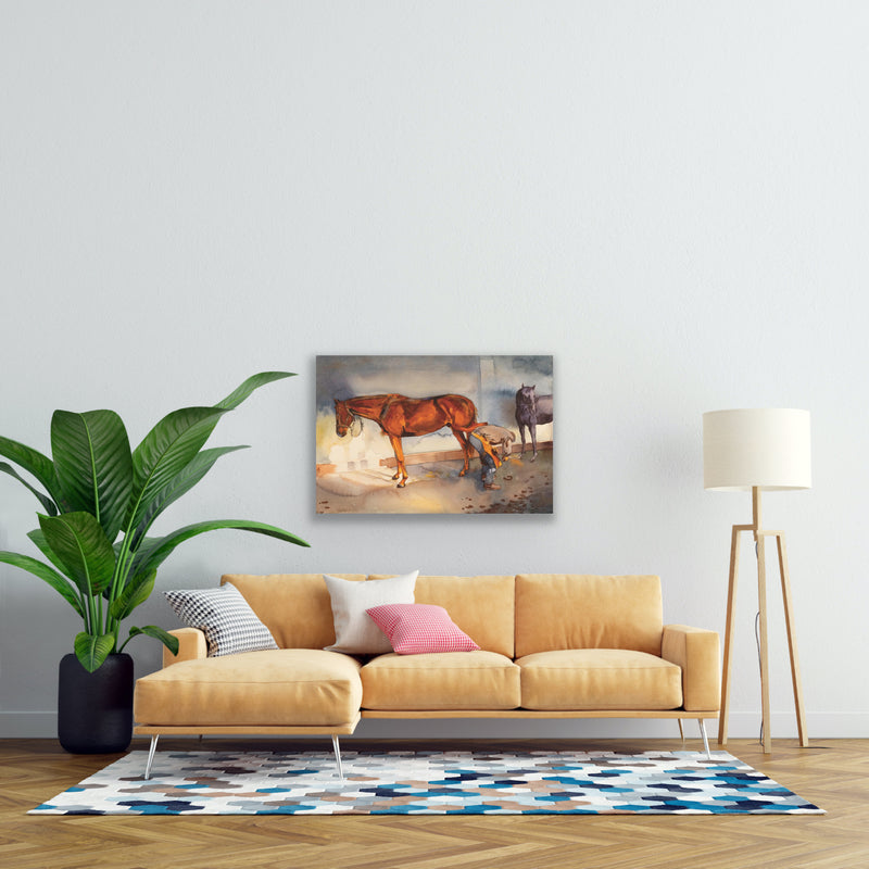 Watercolor painting of a French Saddlebred getting shoed by its farrier.