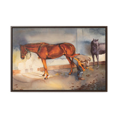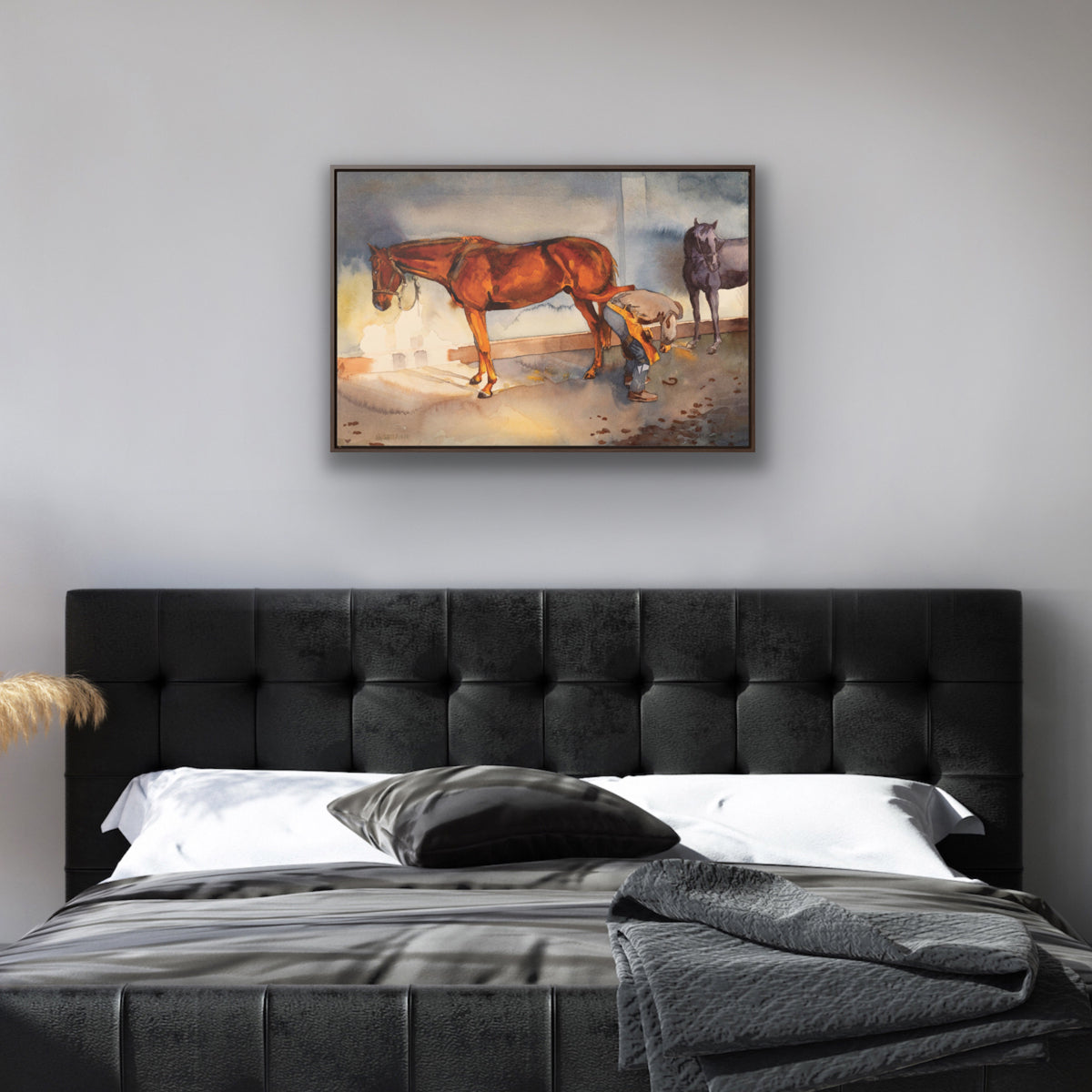 Watercolor painting of a French Saddlebred getting shoed by its farrier.