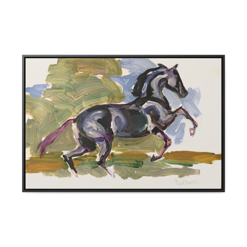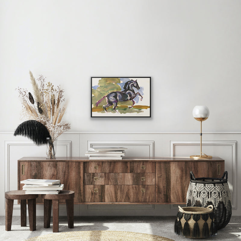 Beautiful acrylic painting of a black boisterous Anglo-Arab stallion in nature.