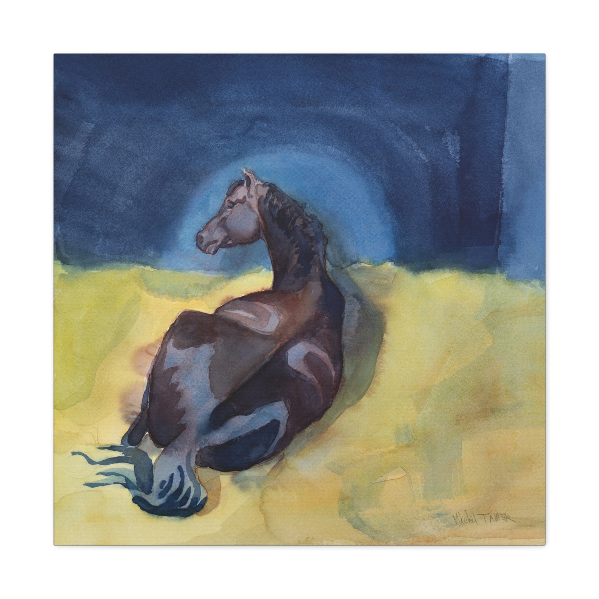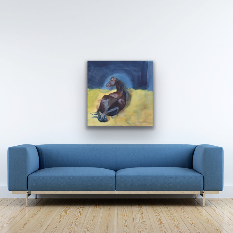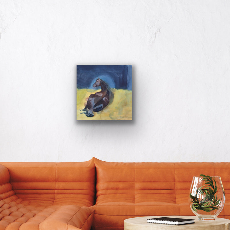 Watercolor painting of a brown French Saddlebred horse resting in its box.