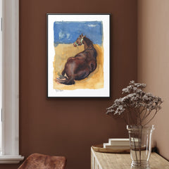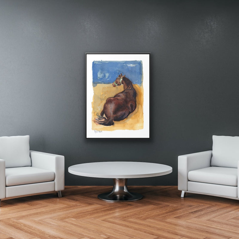 Watercolor Painting of a Brown French Saddlebred horse resting on sand on a blue sky day.