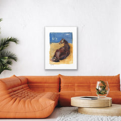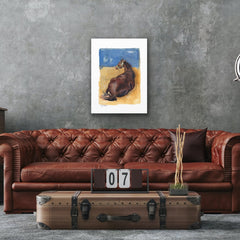 Watercolor Painting of a Brown French Saddlebred horse resting on sand on a blue sky day.