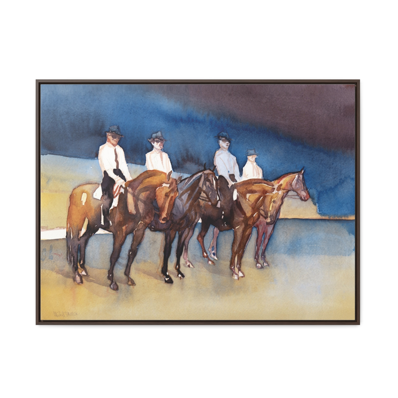 Watercolor painting of an equine dressage show in hommage to the Blues Brothers on French Saddlebred horses.