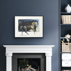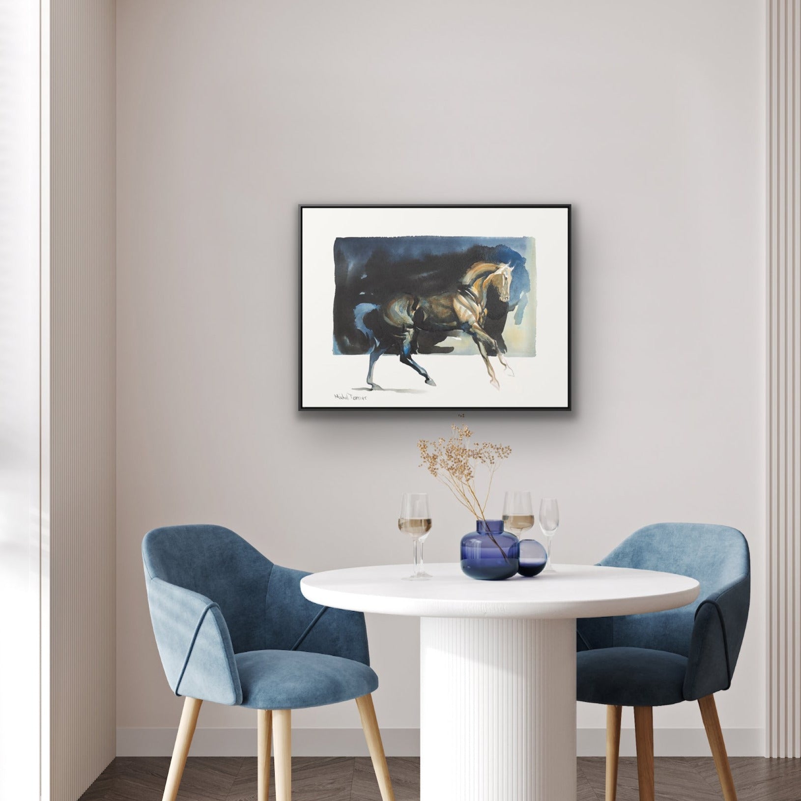 Watercolor Painting of a brown thoroughbred horse cantering in the night.