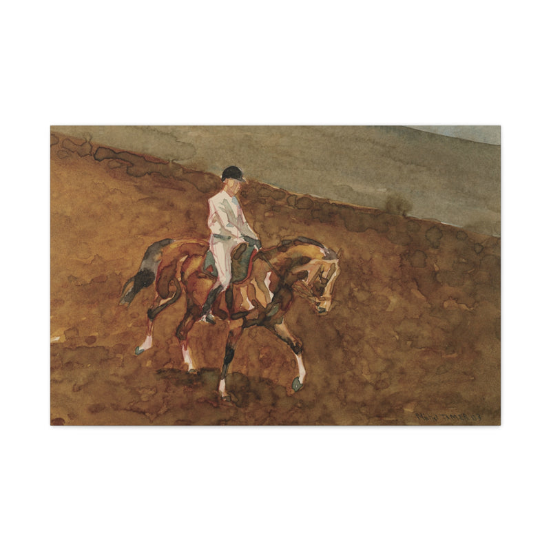 watercolor painting of a trainer conditionning a French Saddlebred horse for dressage.
