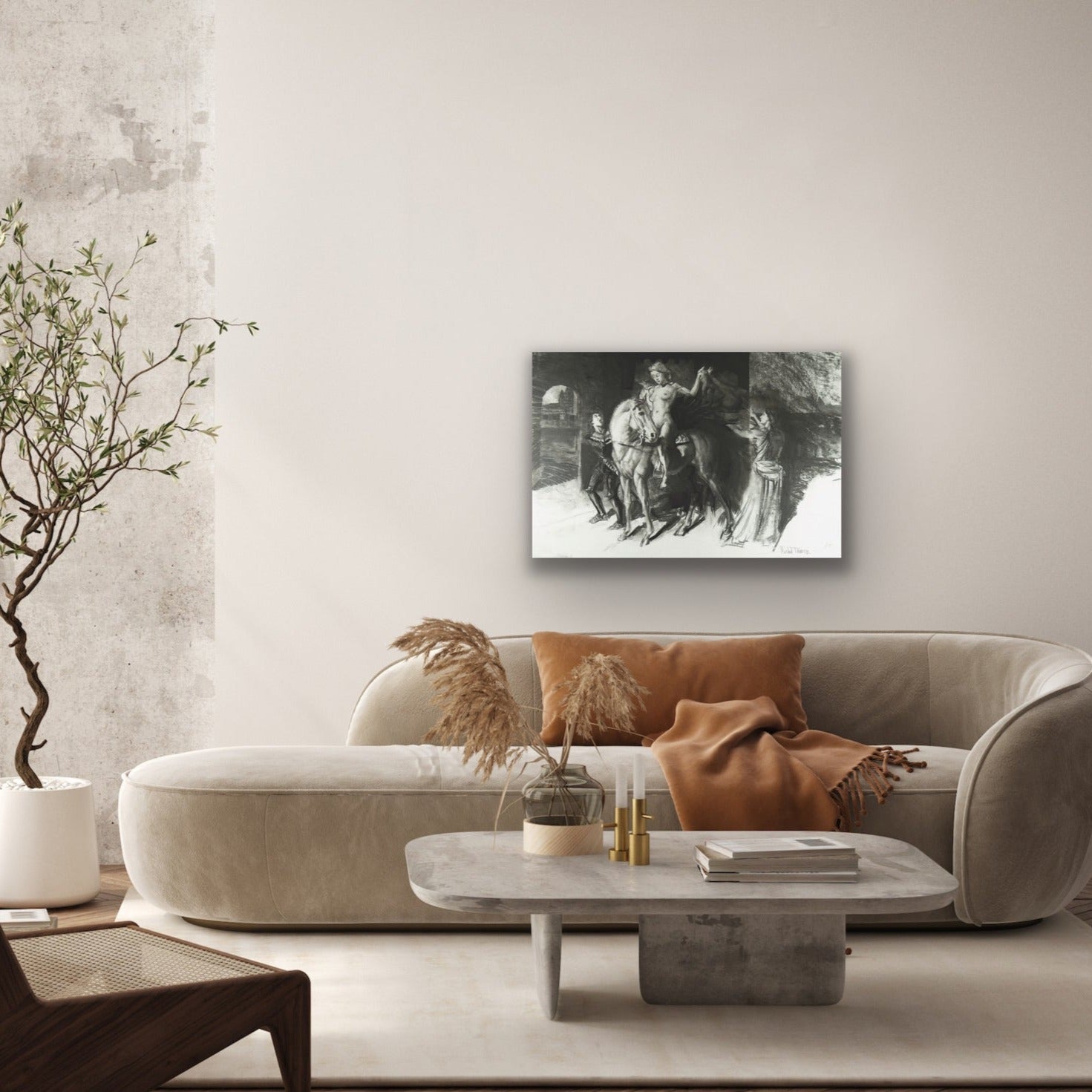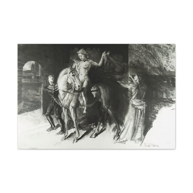 Charcoal of Lady Godiva nude on her horse in rebellion against her husband's cruelty.