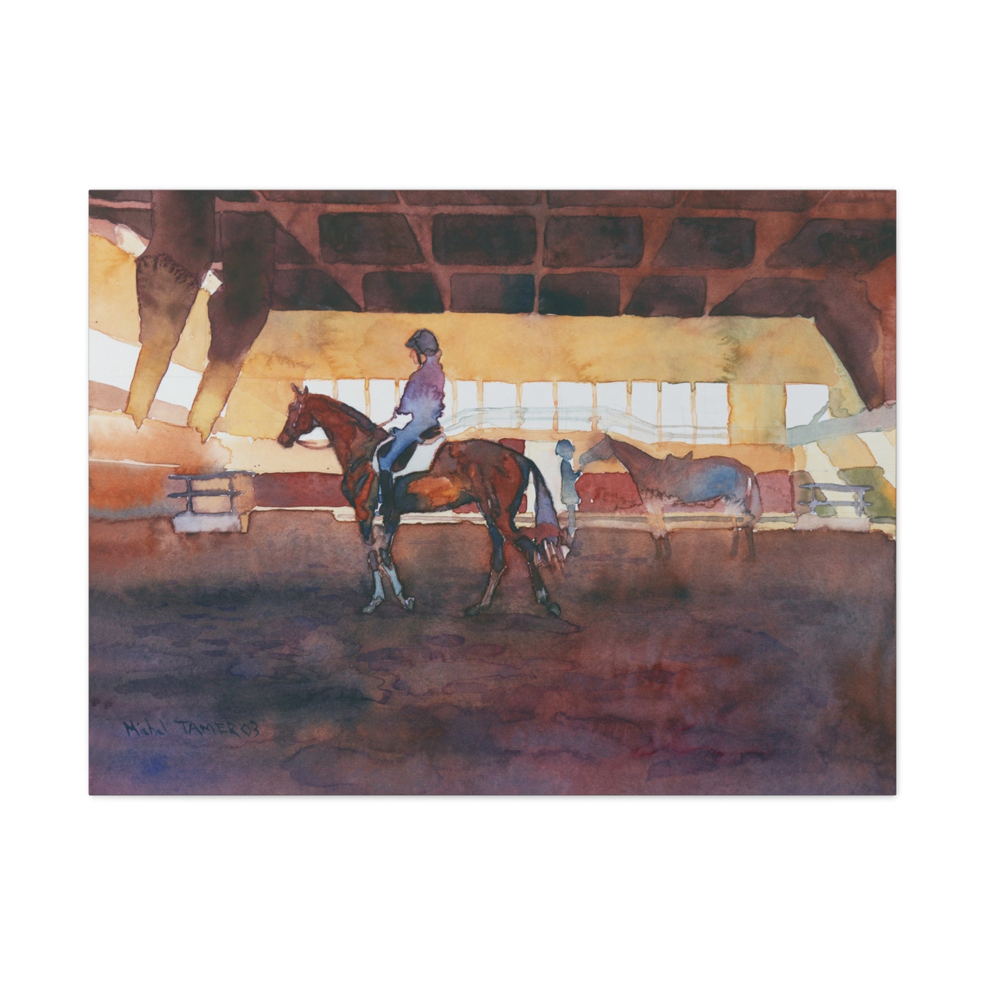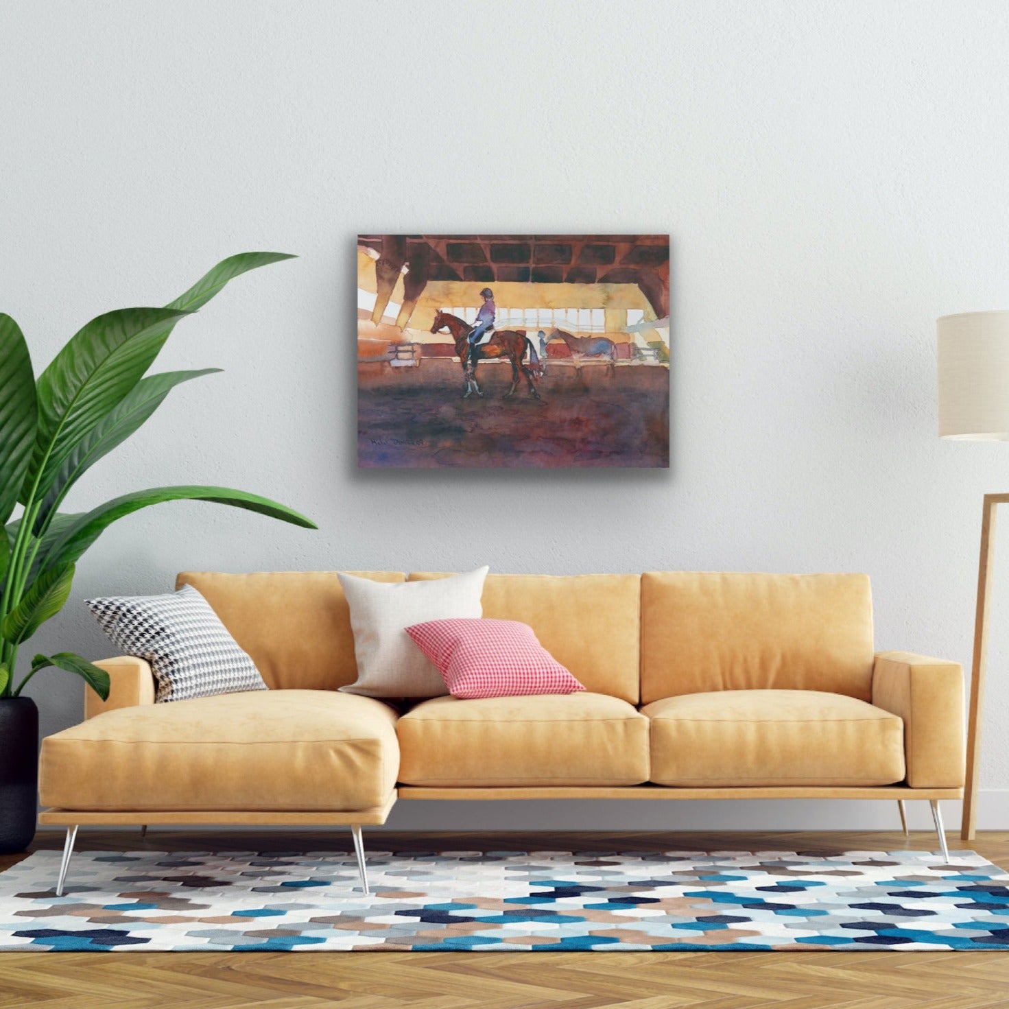 Watercolor painting of a woman riding French Saddlebred horse during a dressage session.