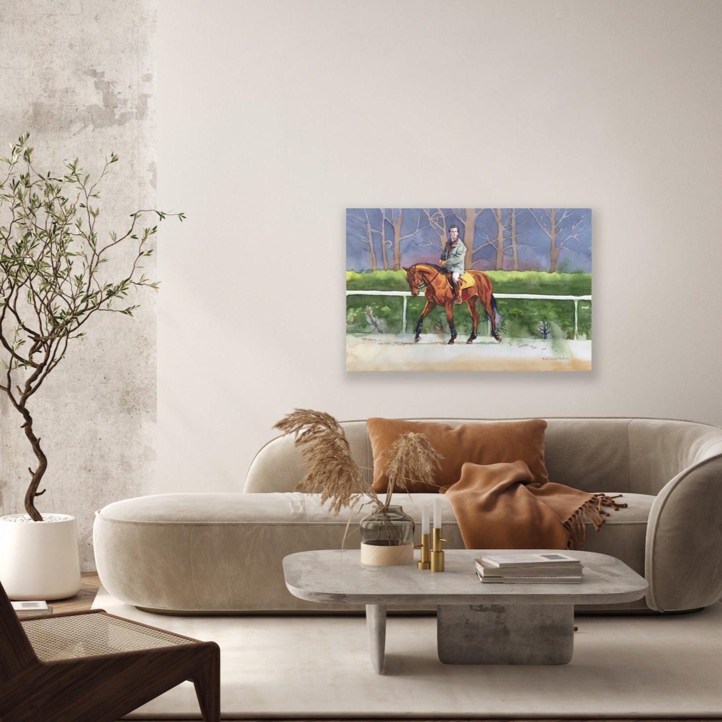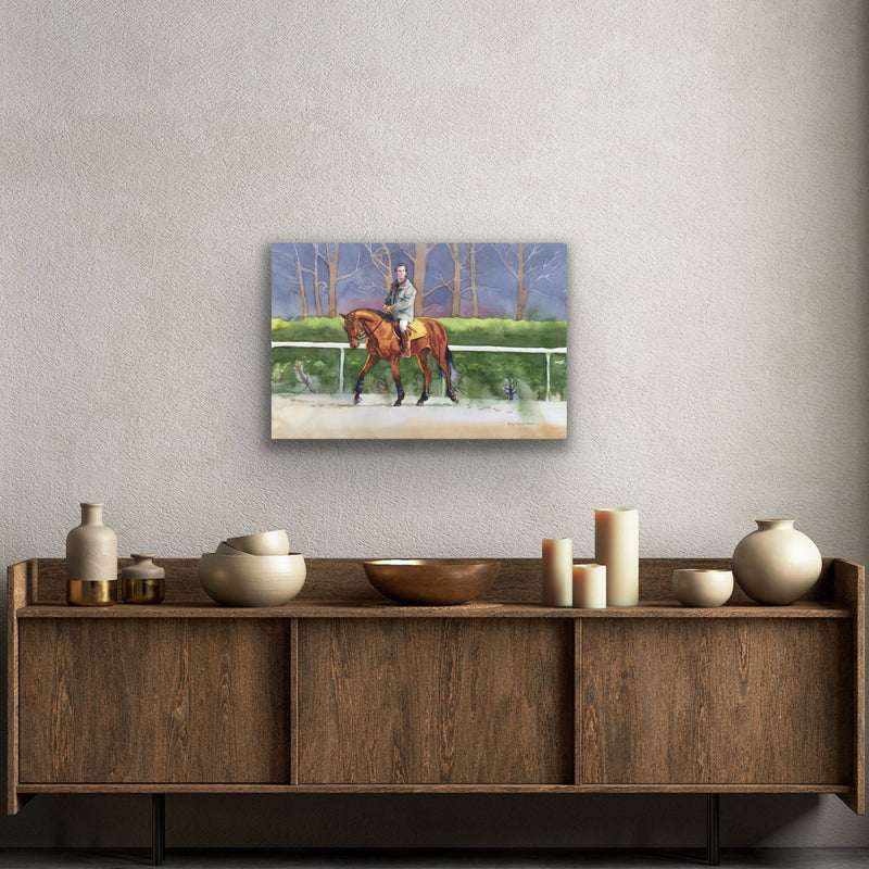 Watercolor of a riding instructor giving a lesson on its French Saddlebred during the Parisian winter.