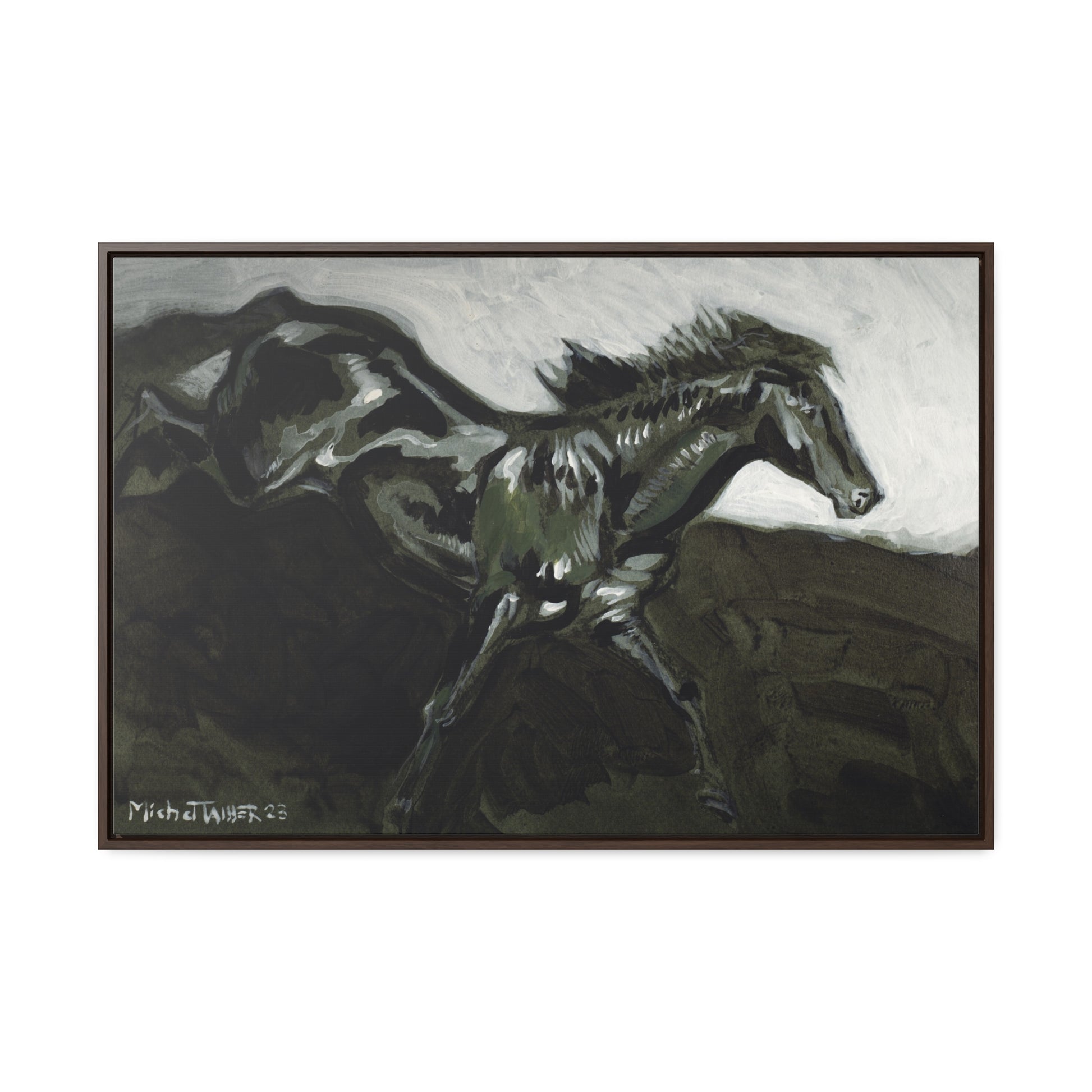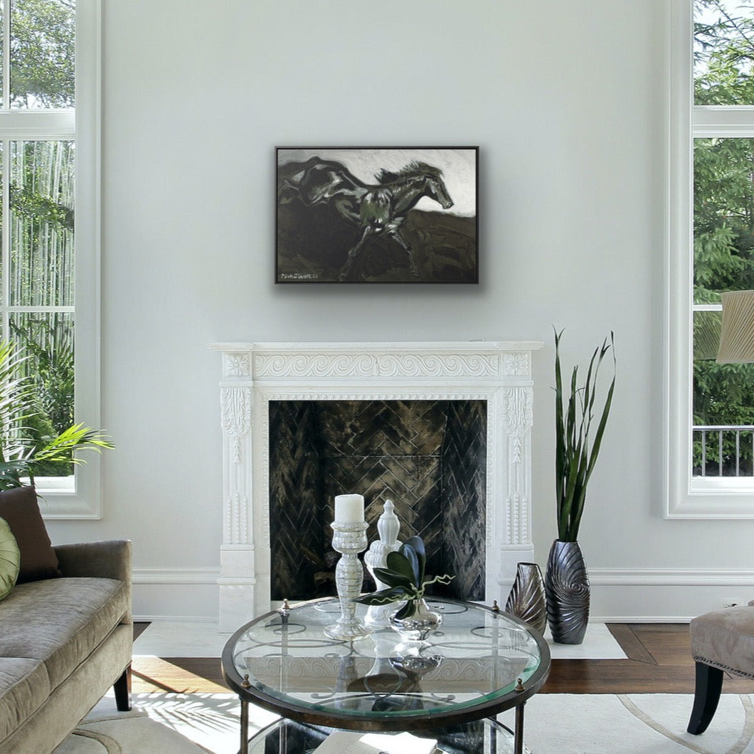 Acrylic painting of a black horse galloping with fiery energy.