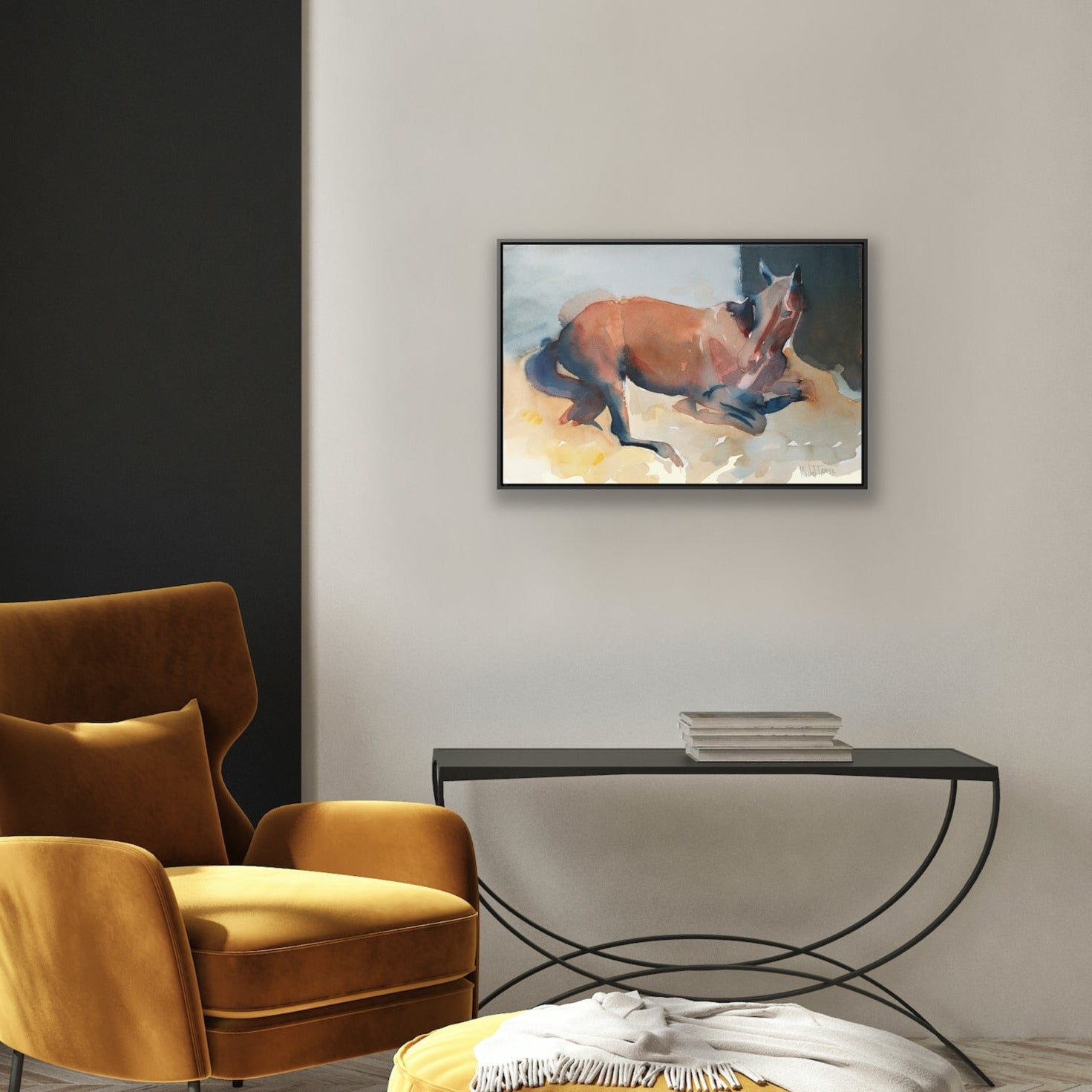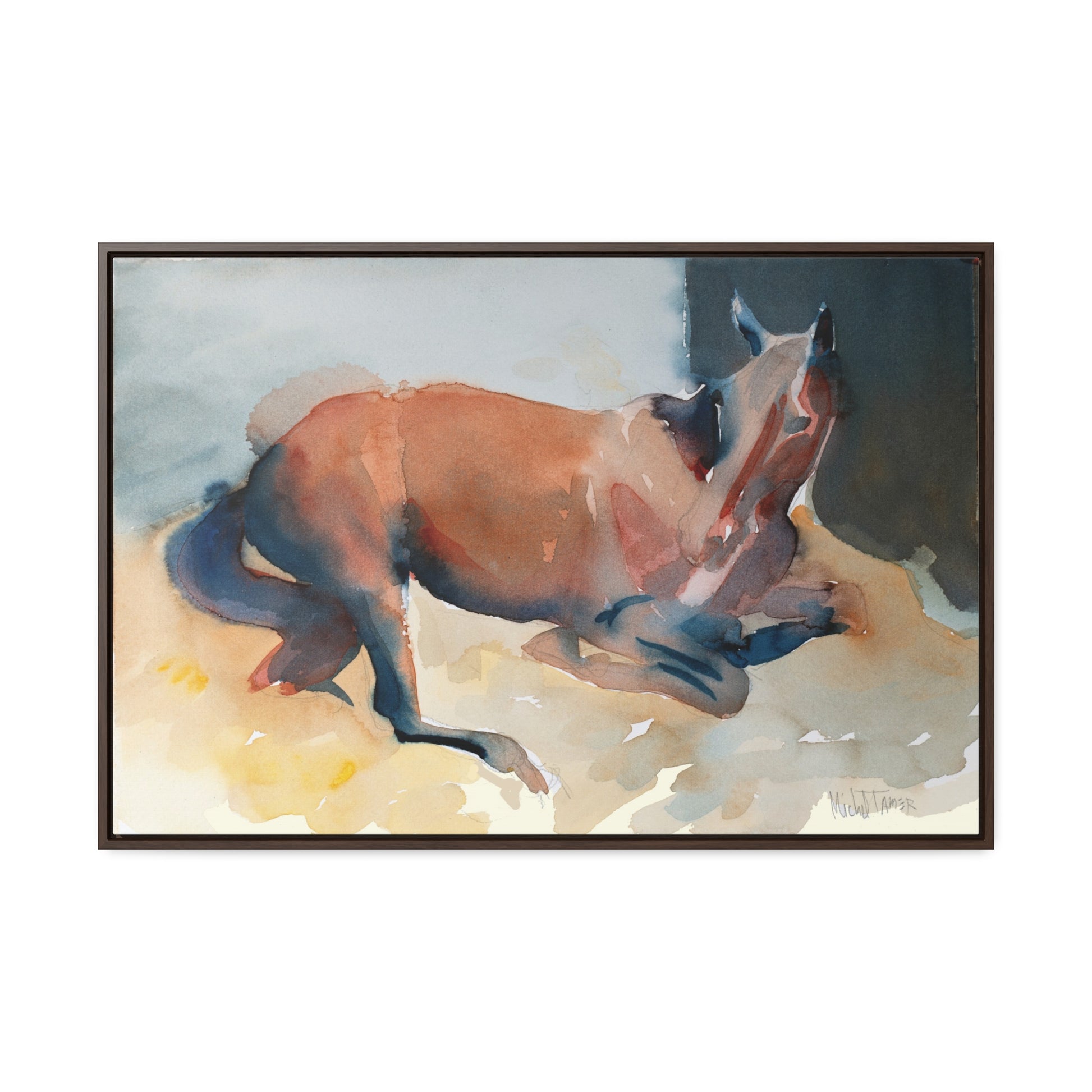 Beautiful watercolor painting of a French Saddlebred horse resting in its box.