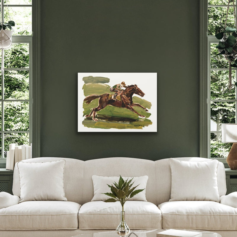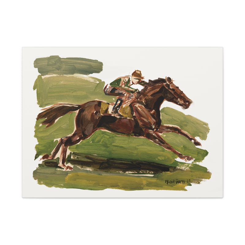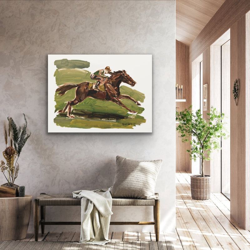 Acrylic painting of a brown thoroughbred and its jockey racing on a sky background.