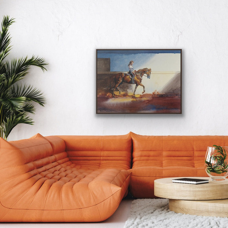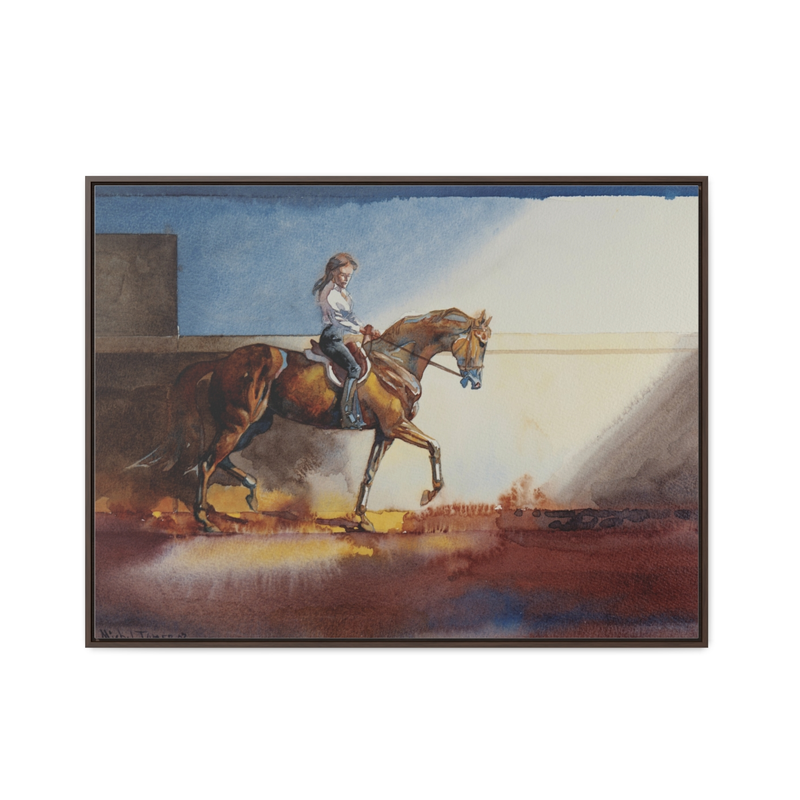 Watercolor painting of a rider leading her Hanoverian horse into the sunbeam.