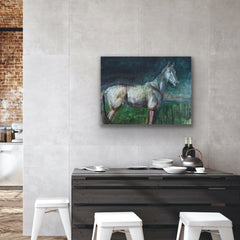 Acrylic painting of a dreamlike vision a white mustang horse close-up.
