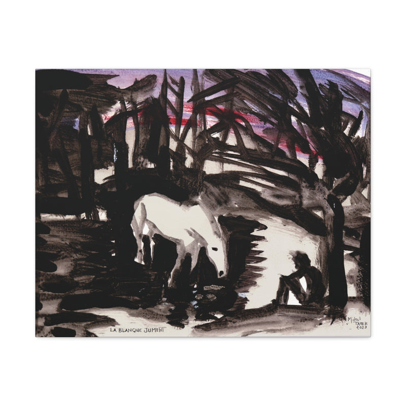 Acrylic painting of La Blanque Jument’s legend meeting a traveller in a mysterious forest.
