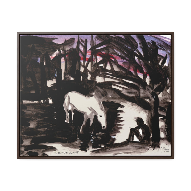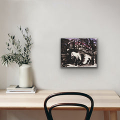 Acrylic painting of La Blanque Jument’s legend meeting a traveller in a mysterious forest.