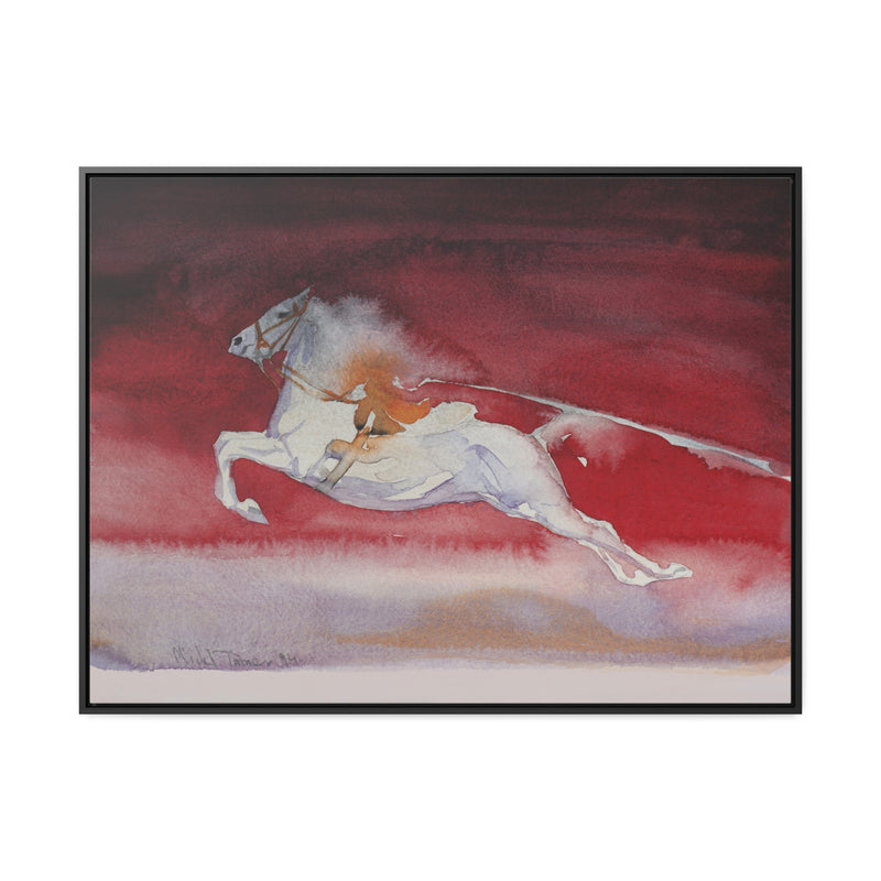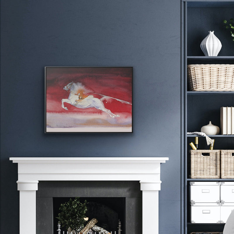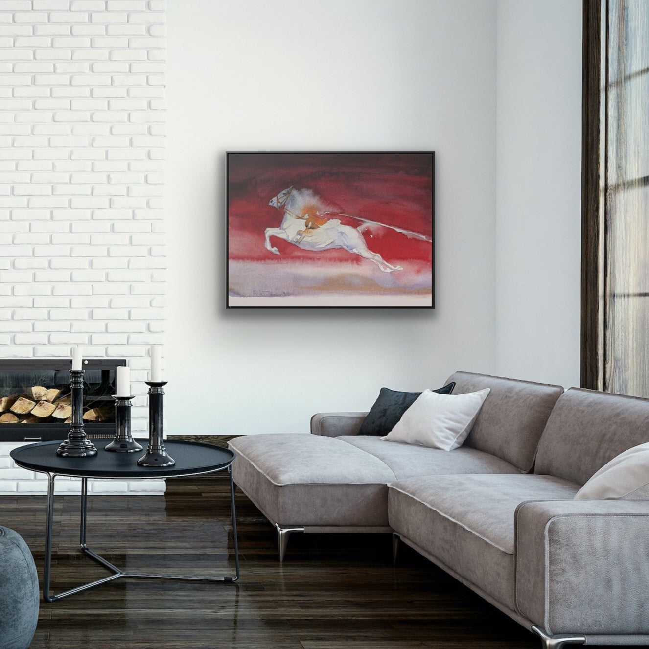 Watercolor painting of a white Lippizaner horse performing a graceful ruade in a dramatic red sky.