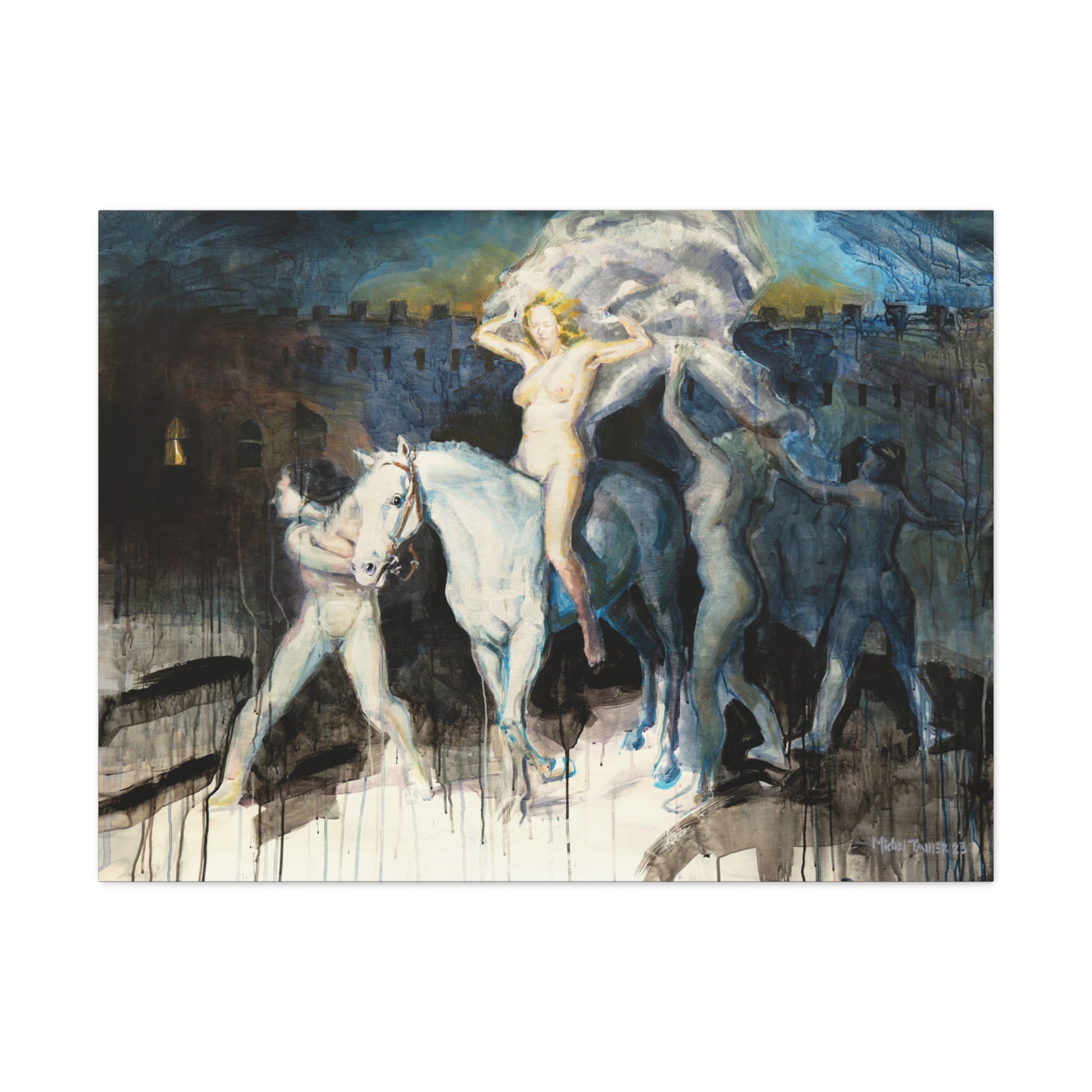 Acrylic painting of Lady Godiva nude on her horse in rebellion against her husband's cruelty.