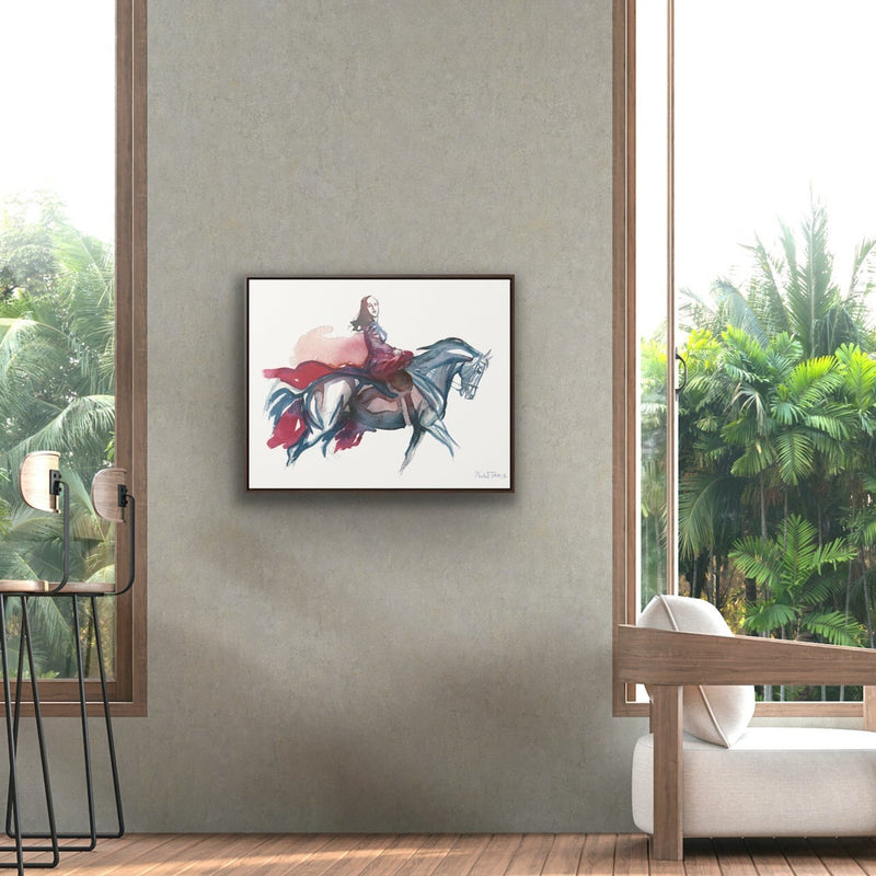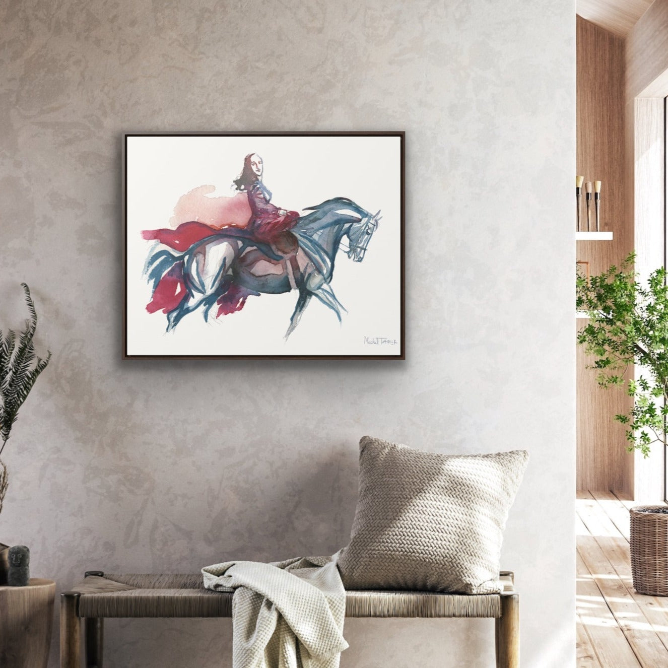 Watercolor painting of the lady rider on her French Saddlebred horse striding with pride.