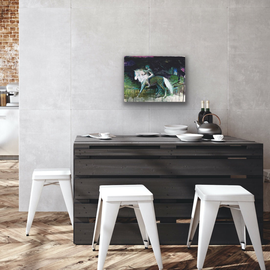 Acrylic Painting of Leimminkäien running away on the demon's horse after being rejected by his love interest.
