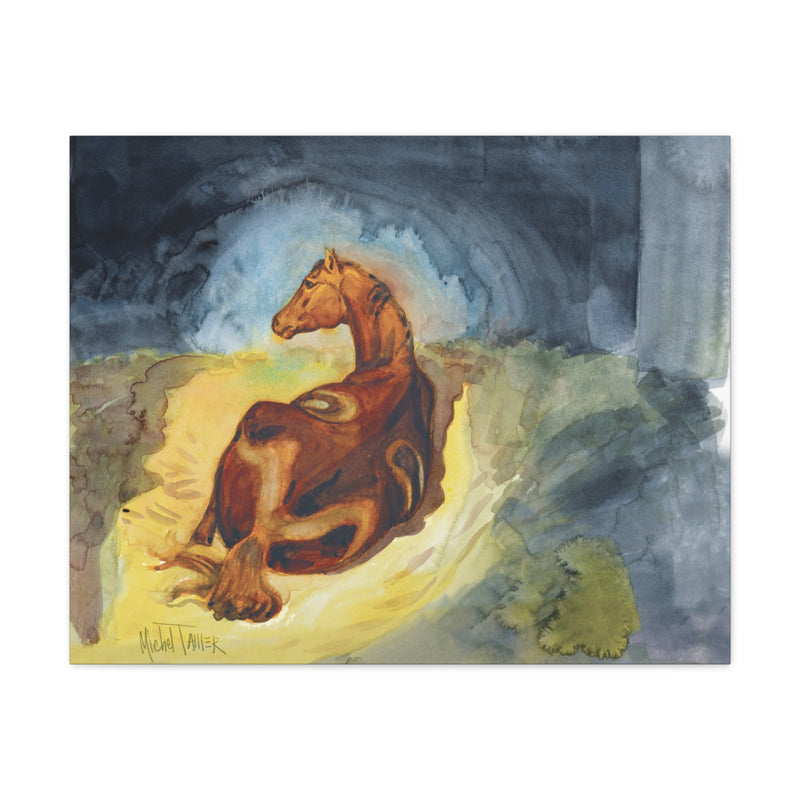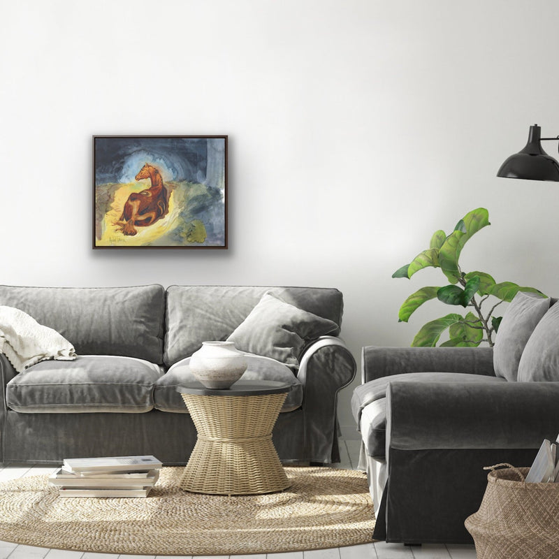 Watercolor painting of a brown French Saddlebred horse resting in its box.