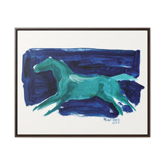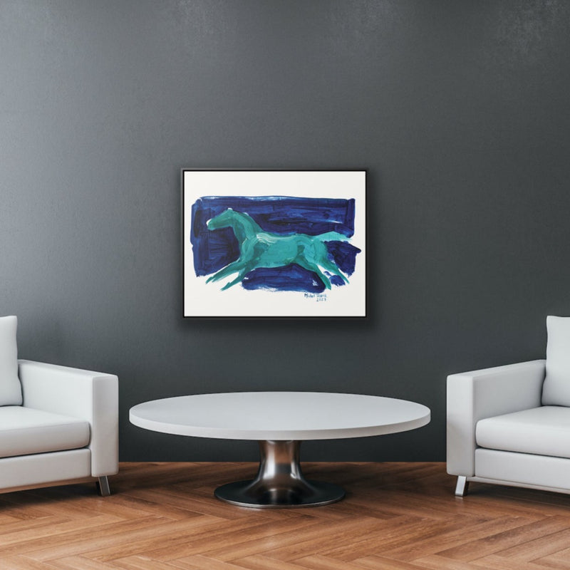 Acrylic Painting of a green Lusitanian horse running on a blue night background.