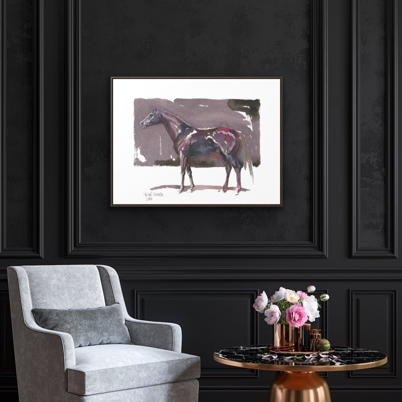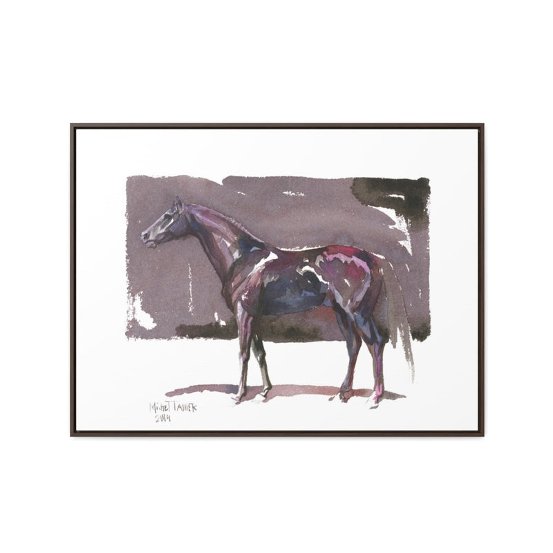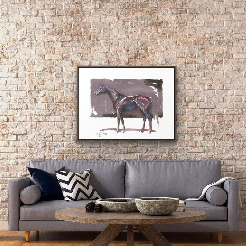 Watercolor painting of a horse in hues of purple on a brown backdrop.