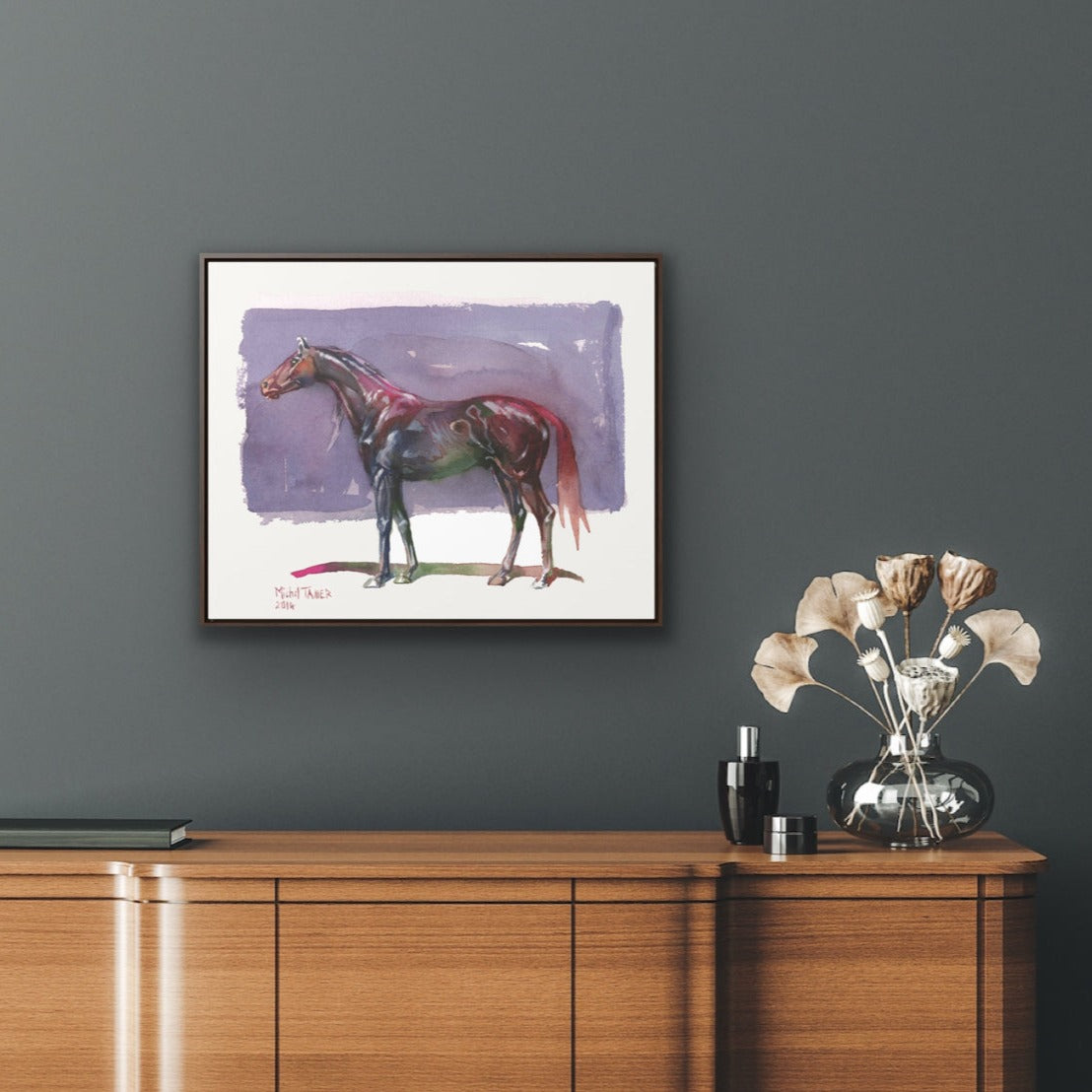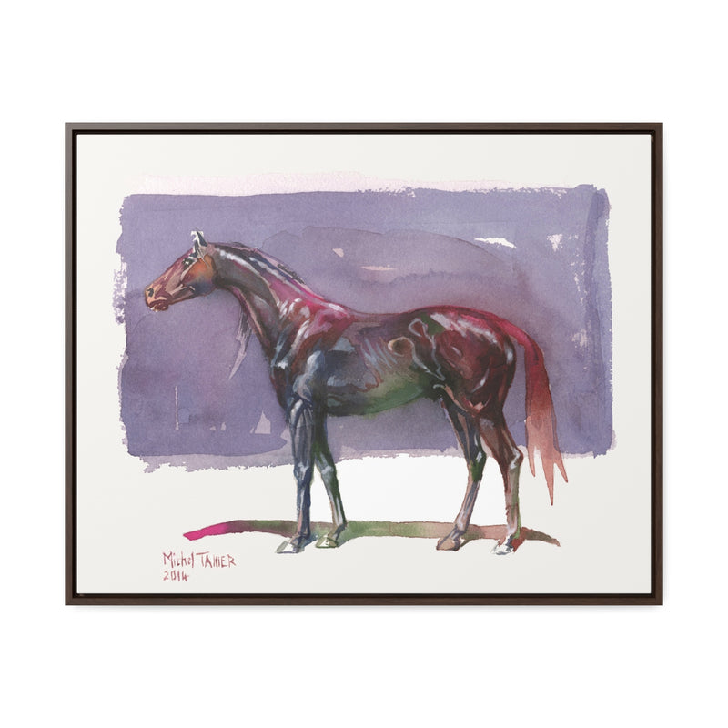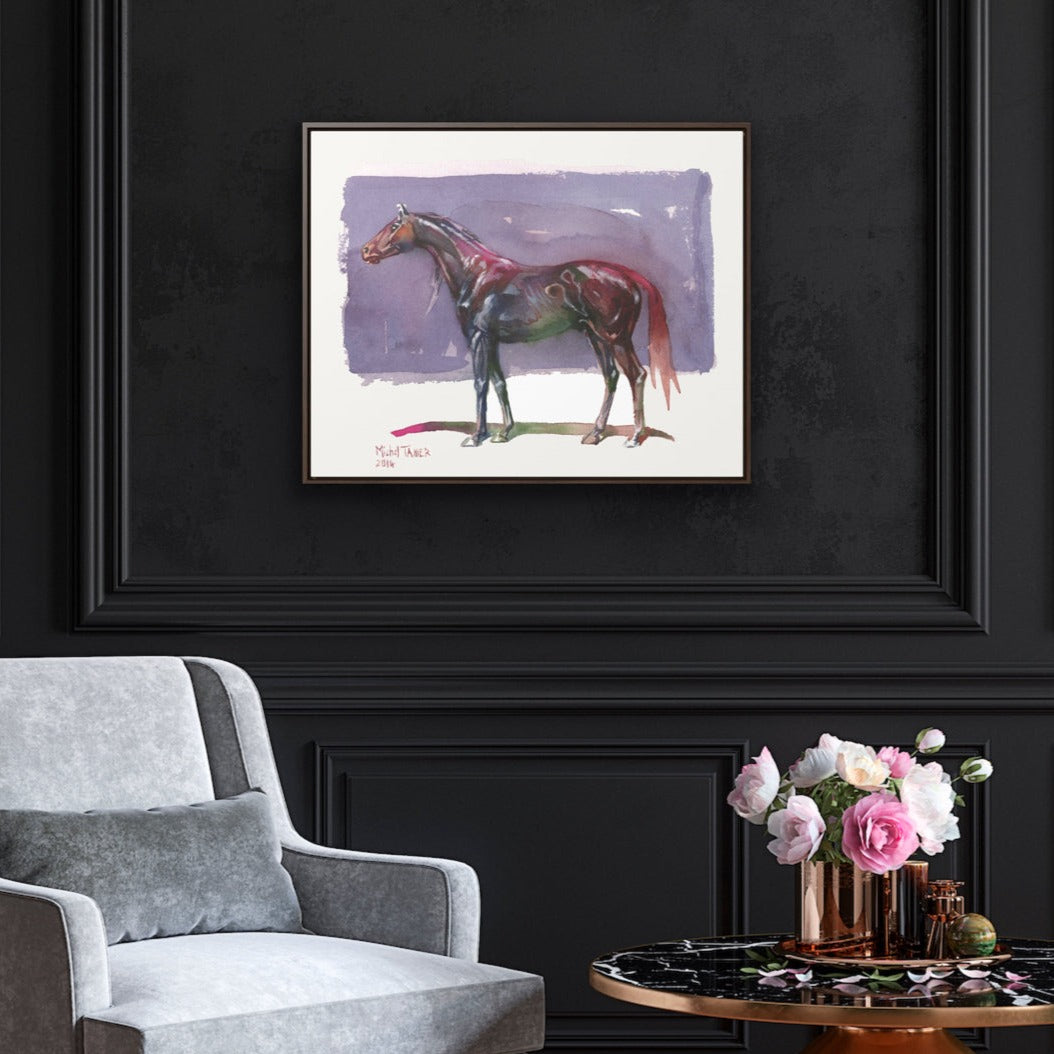 Watercolor painting of a thoroughbred horse against a purple backdrop.