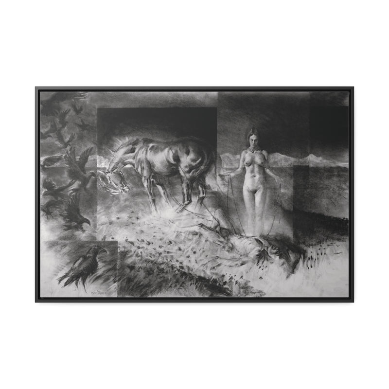 Charcoal drawing of Mazeppa being rescued from the torture of being attached naked to a galloping horse for having slept with the wife of a high nobleman in what we now know as Ukraine by a beautiful woman who would become his wife.