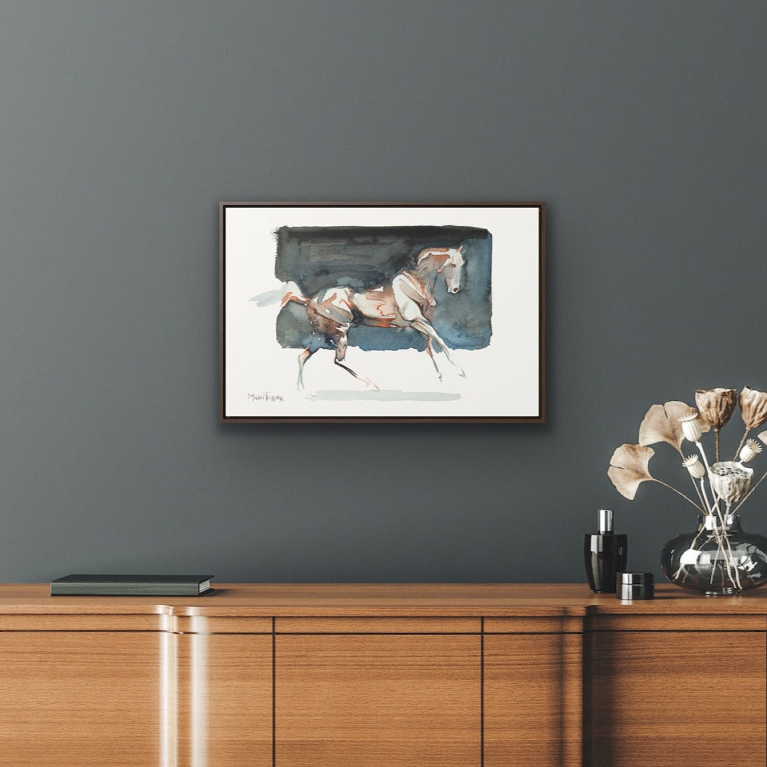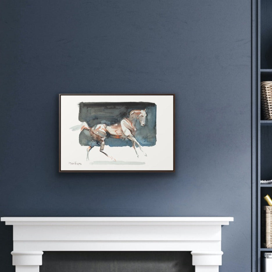 Watercolor painting vignette in which a brown Thoroughbred Horse changes lead.