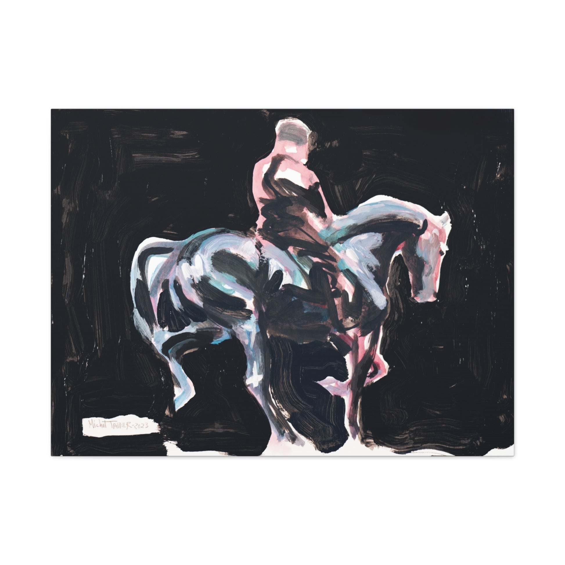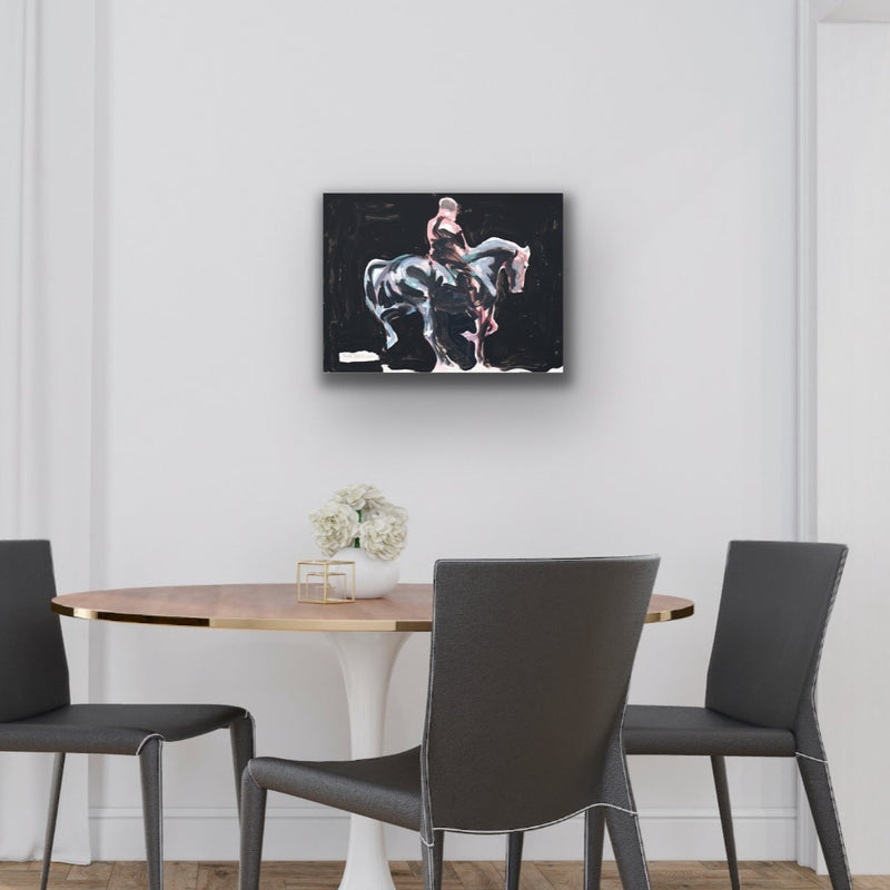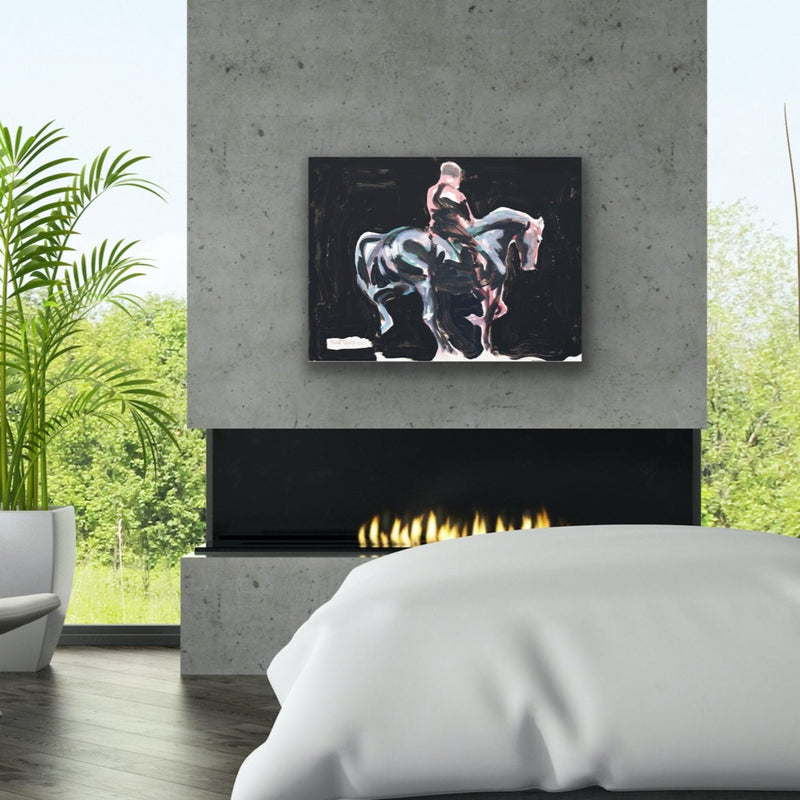 Acrylic painting of a horse carrying its rider into the night as the moonlight reflects on its lustrous black coat.