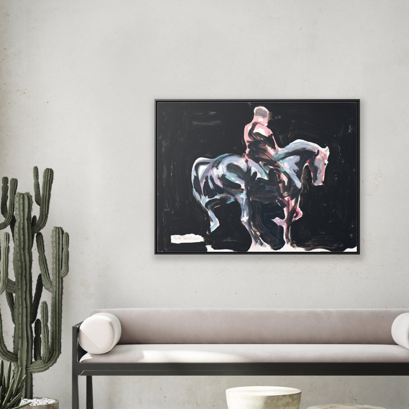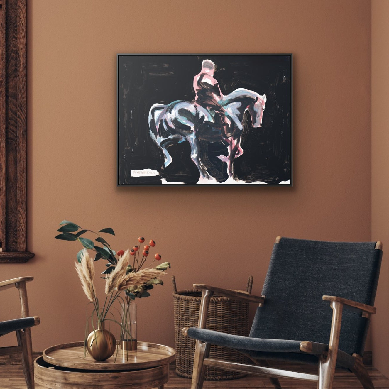 Acrylic painting of a horse carrying its rider into the night as the moonlight reflects on its lustrous black coat.