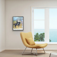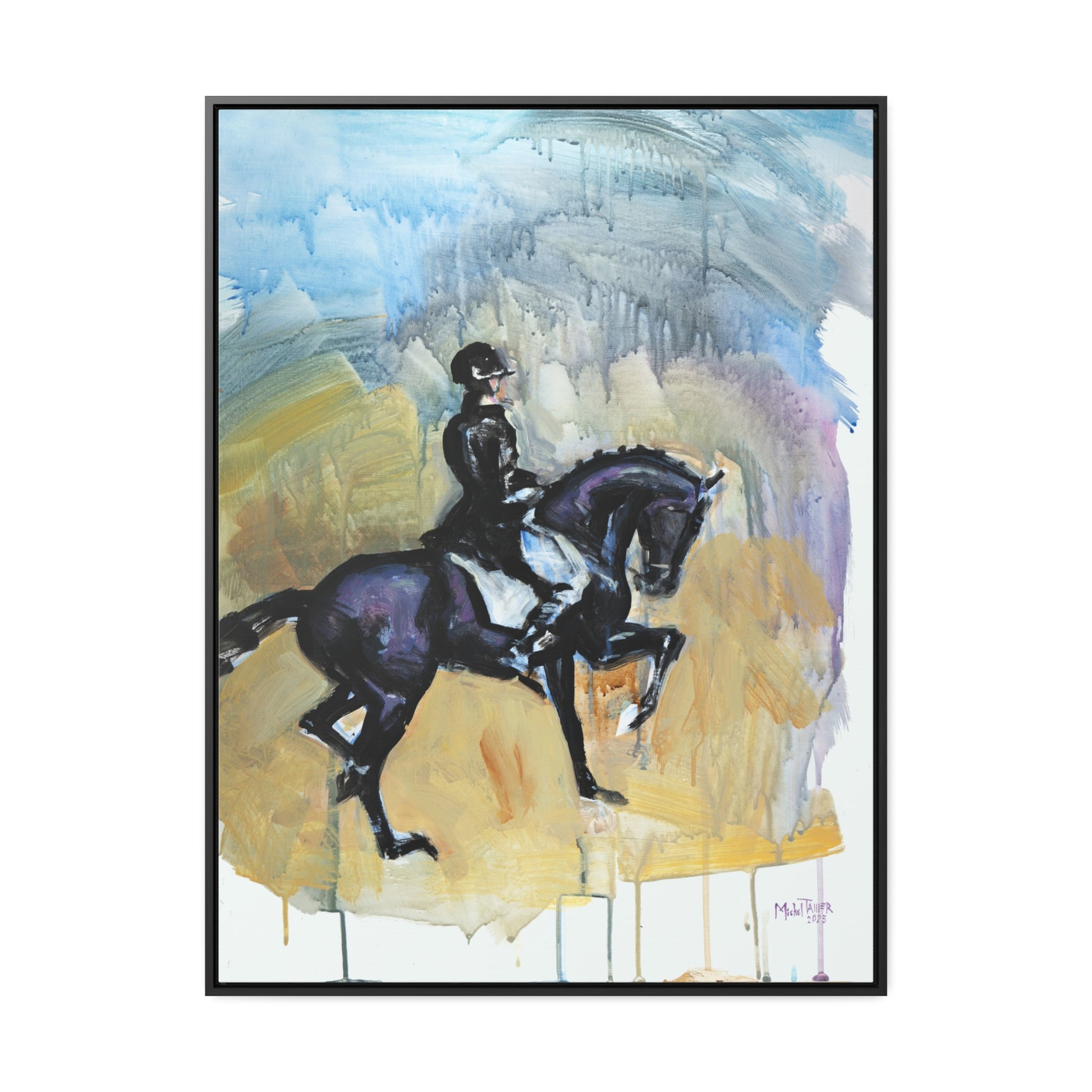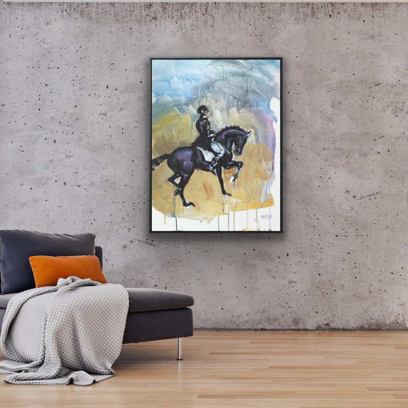 Acrylic painting of a dressage move called "pas de deux" on a black French Saddlebred horse.
