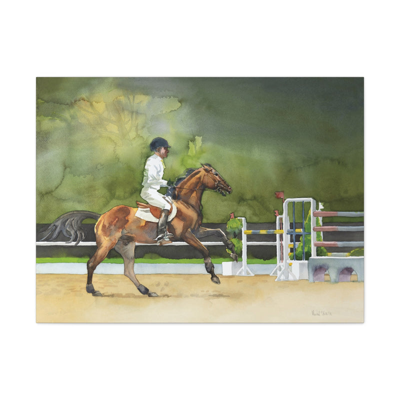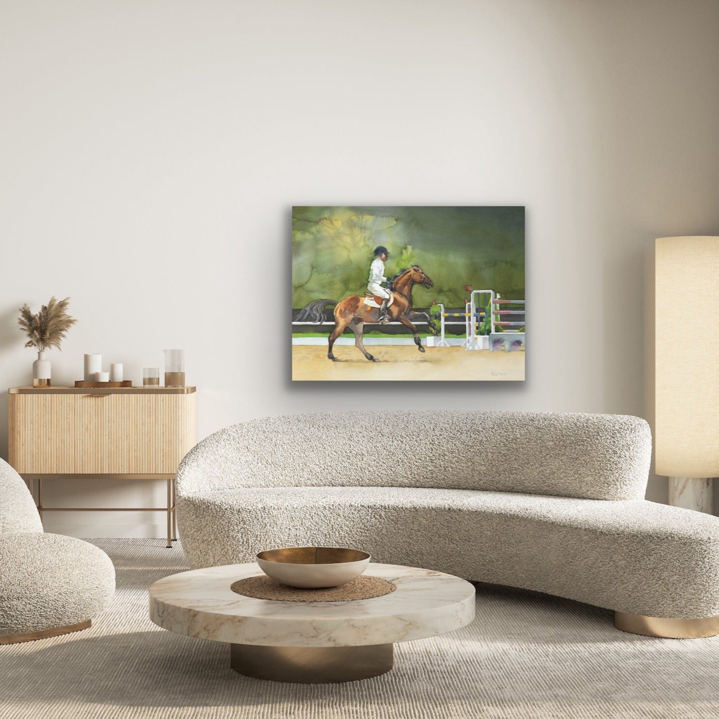 Watercolor painting of a rider preparing to jump obstacles with its French Saddlebred.