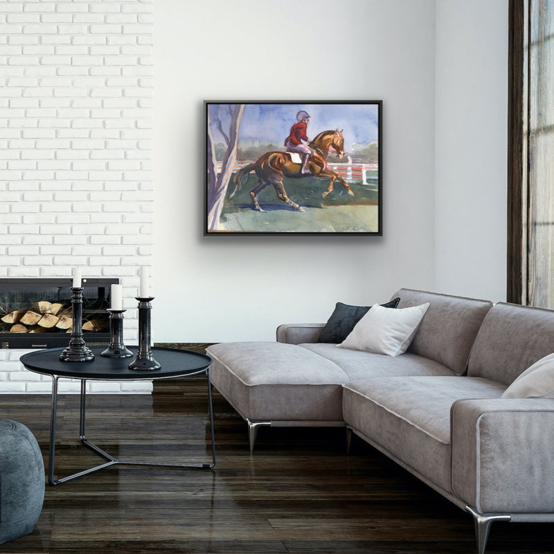 Watercolor painting of a rider leading her horse obstacles jumping.