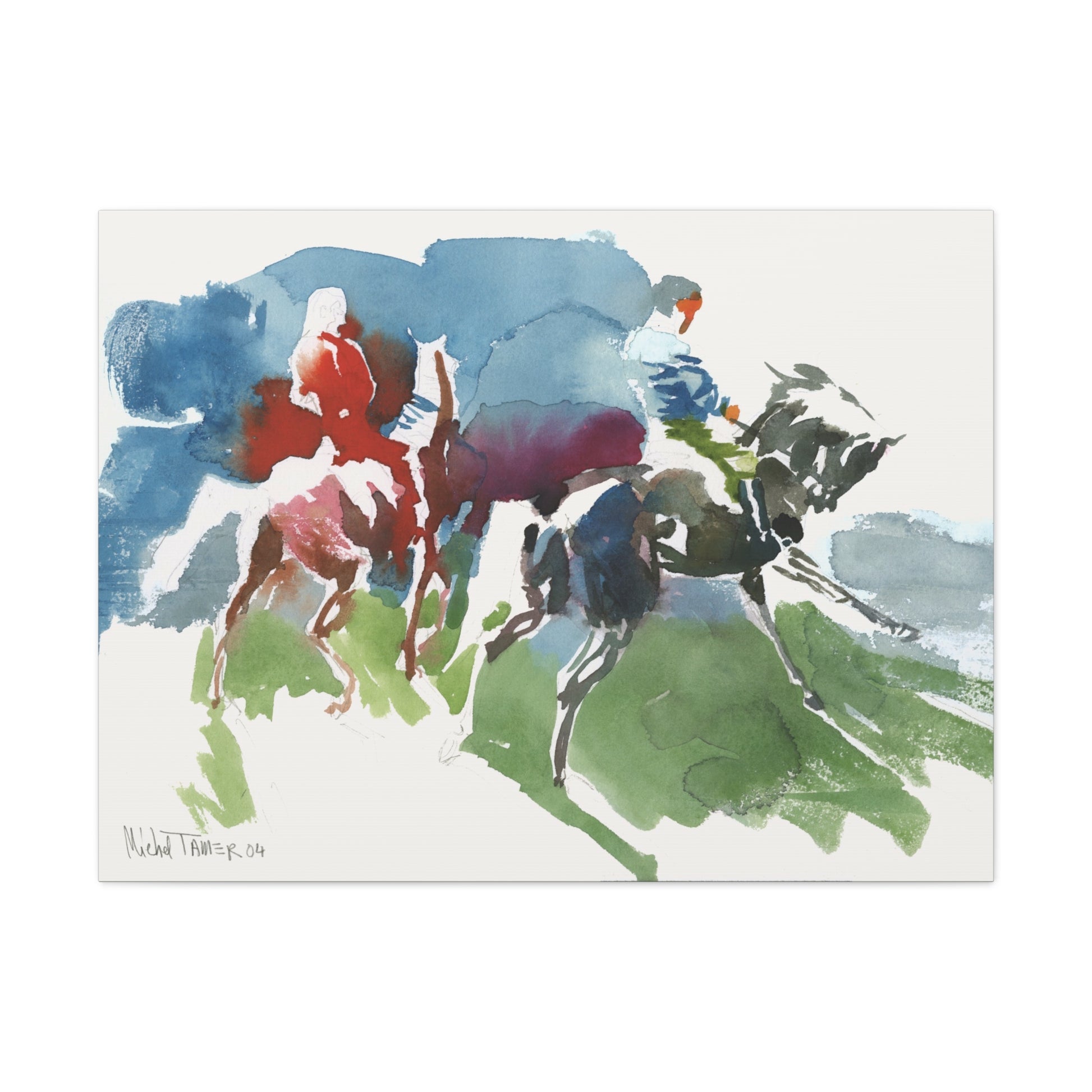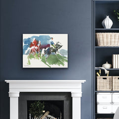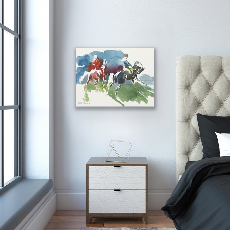 Watercolor painting of two spirited Thoroughbred horses and their jokeys at the gates of the race tracks.