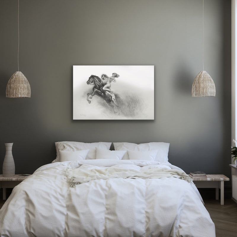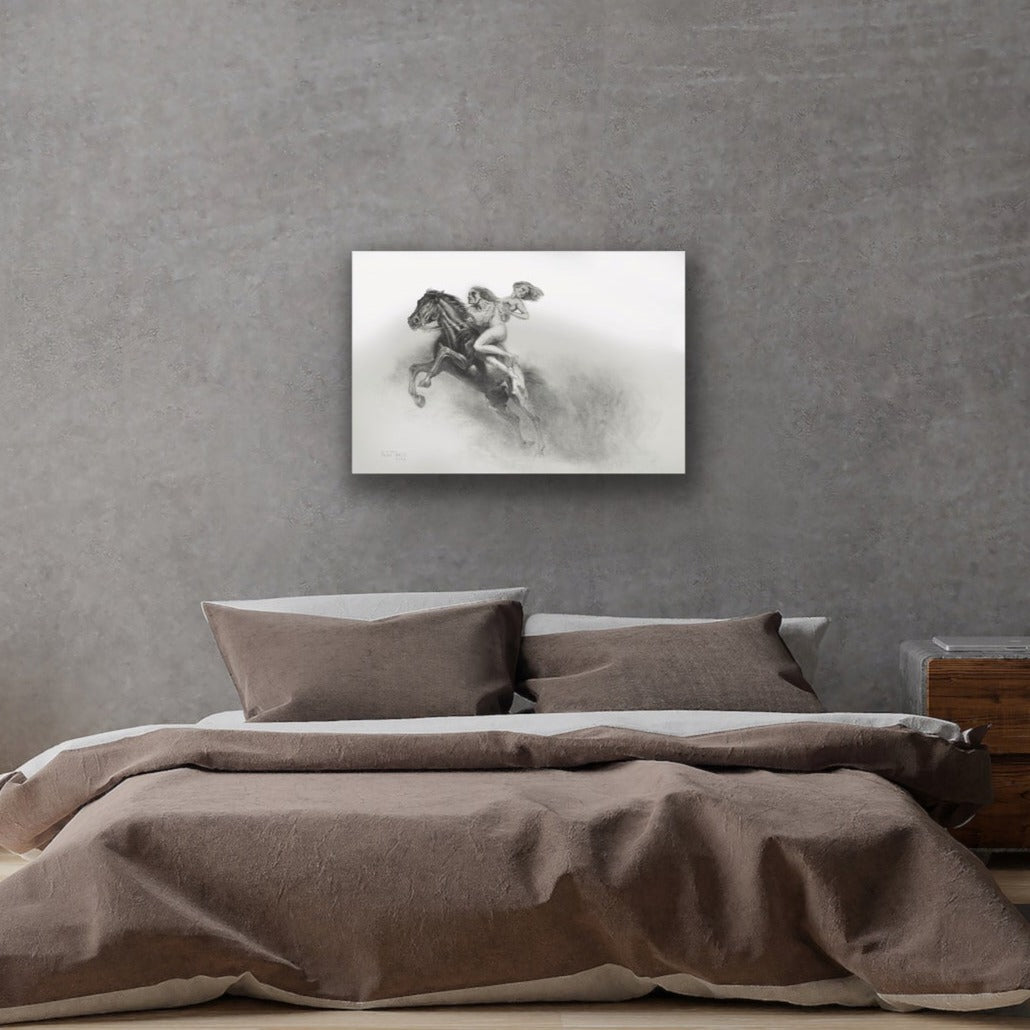 Pencil drawing of Lemminkäinen abducting Kylliki on his horse.