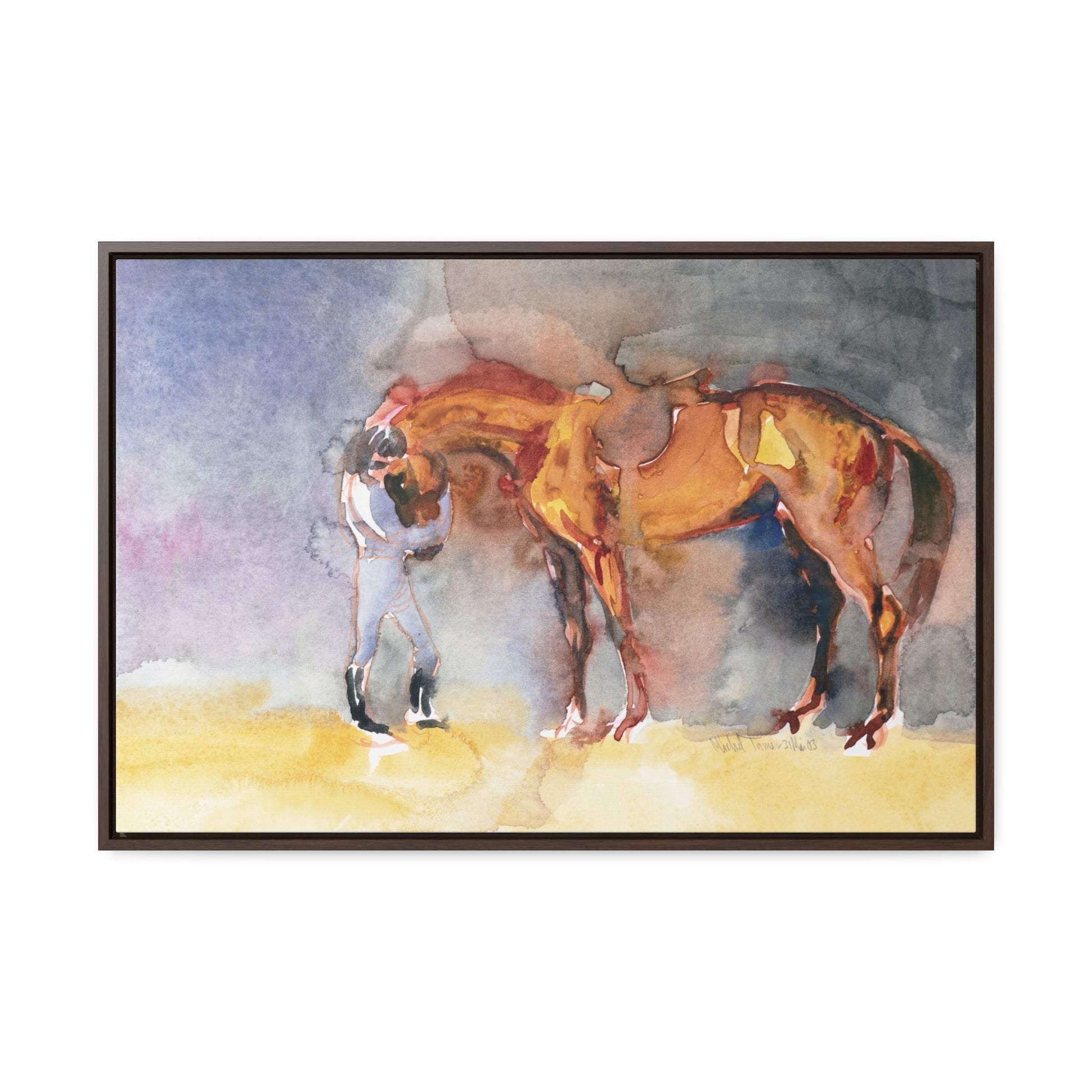 Watercolor painting of a French Saddlebred horse embracing its rider with affection and friendship.