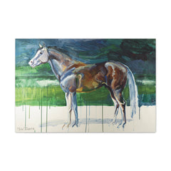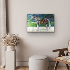 Acrylic painting of a brown thoroughbred horse on a mountain and sky background.