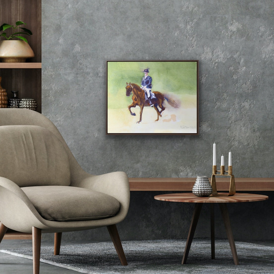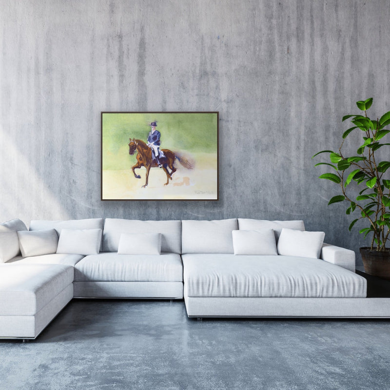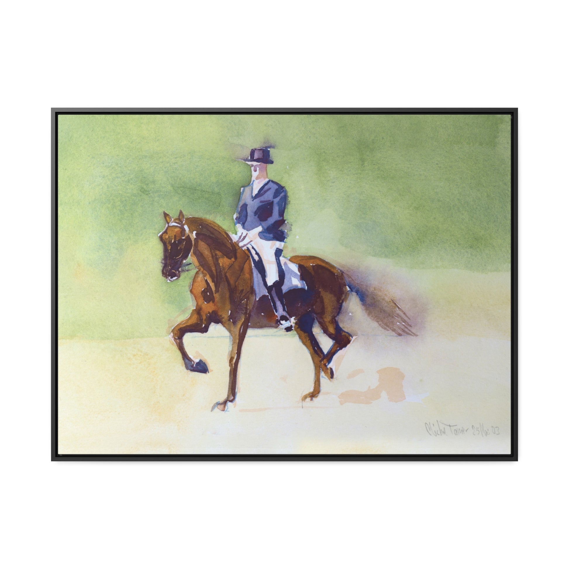Watercolor painting of a rider in formal wear with a top hat riding his horse during a dressage session.